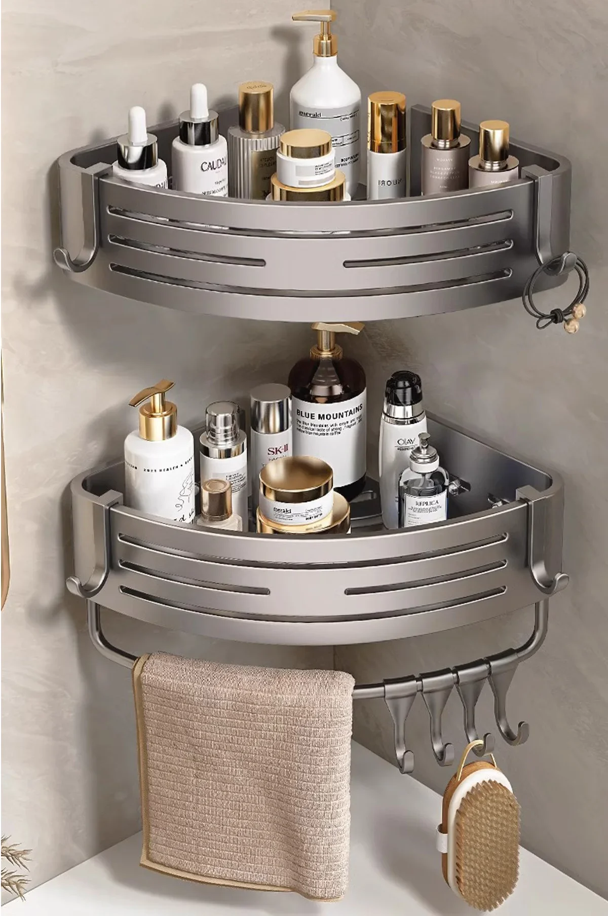 Designed for optimal storage capacity, our corner shelf provides ample space to accommodate a variety of bathroom essentials, freeing up valuable bathroom space. Each shelf comes with two hanging hooks and a towel bar for added convenience.
