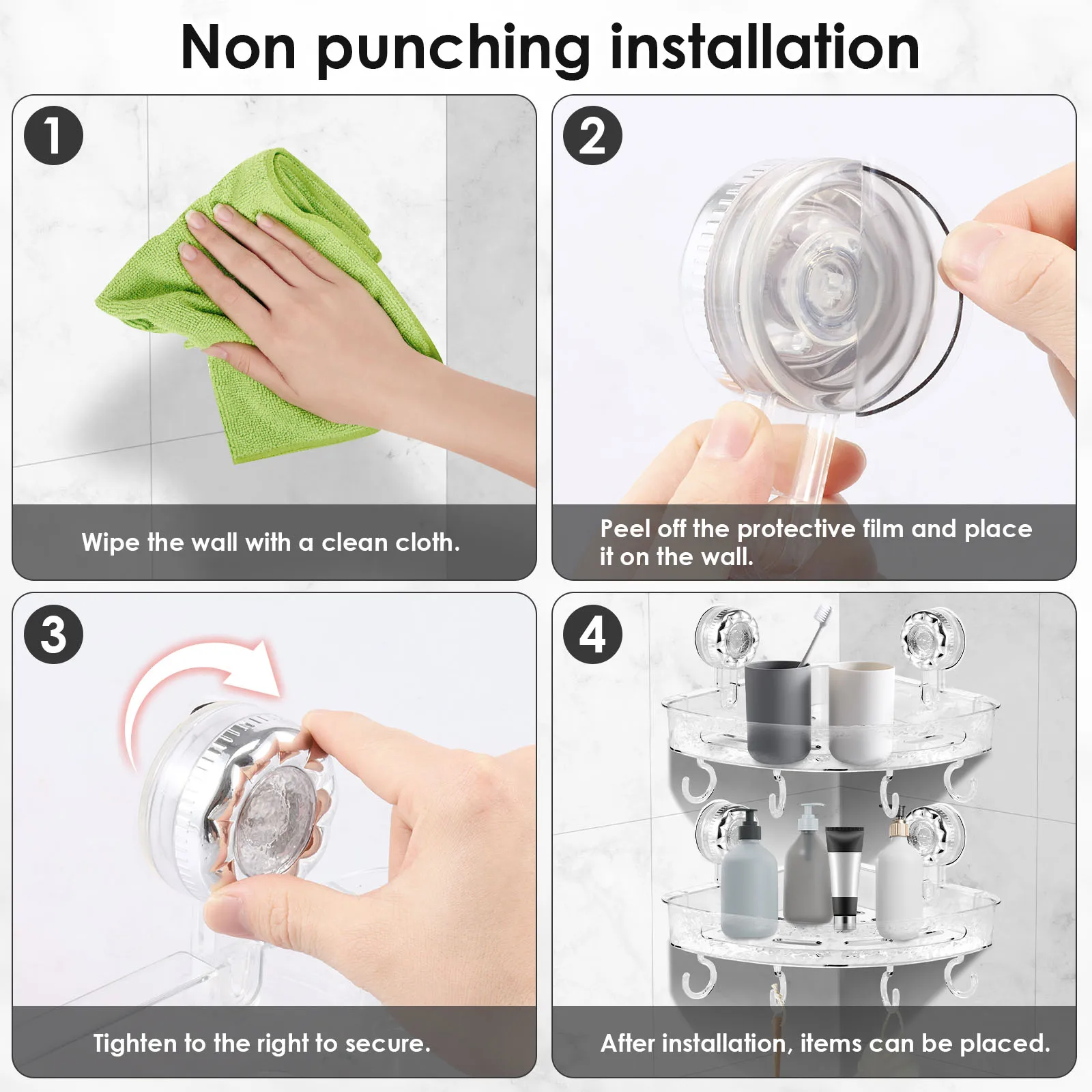 Powerful No Drill Suction Cups: Equipped with robust suction cups, this bathroom storage holder allows for effortless installation on any smooth surface. Say goodbye to drilling holes, as it attaches securely without causing any damage to your walls