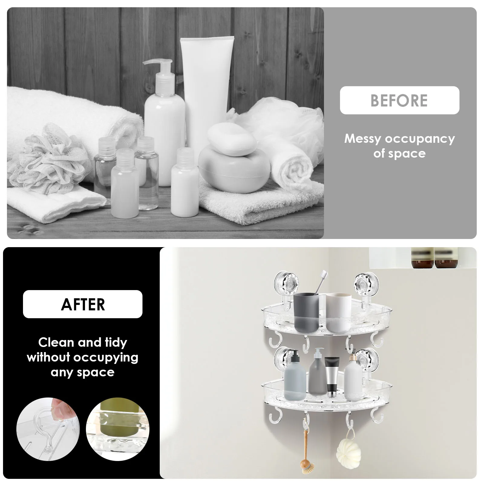 Ample Storage Capacity: Our corner shower caddy offers abundant space to safely store shampoos, conditioners, soaps, and other shower essentials, keeping your bathing area organized and clutter free