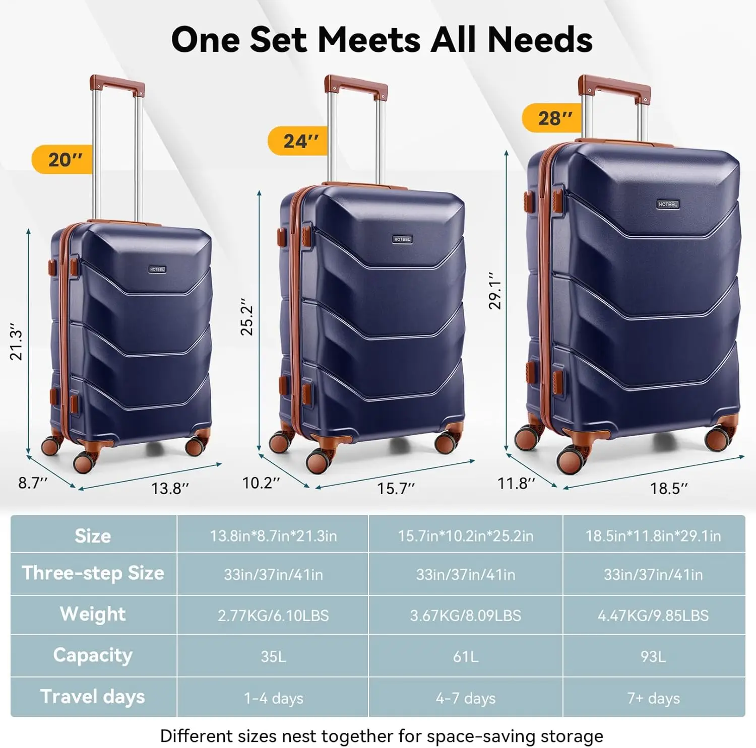 Durable & Lightweight: 3-piece luggage set features thickened ABS material, perfectly balancing durability and lightweight. Reinforced hardshell ensures superior impact protection, while scratch-resistant texture maintains appearance through countless trips. Luggage available in three sizes (20"/24"/28") for all your travel needs.