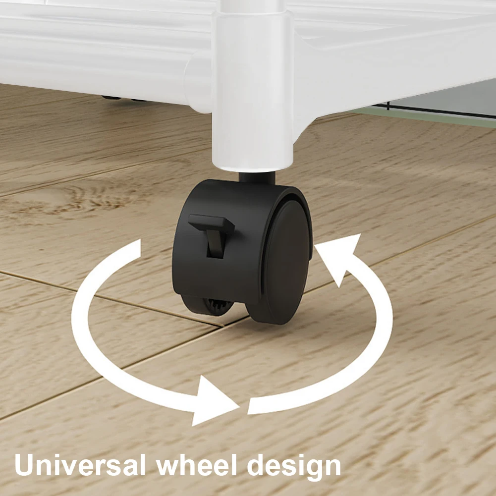 2. 360° Rotating Wheels: Equipped with four 360° swivel wheels, this storage rack protects your floors from scratches. The wheels are both rotatable and lockable, making it easy to move the shelf to any space like the kitchen, pantry, or garage and lock it in place when needed.