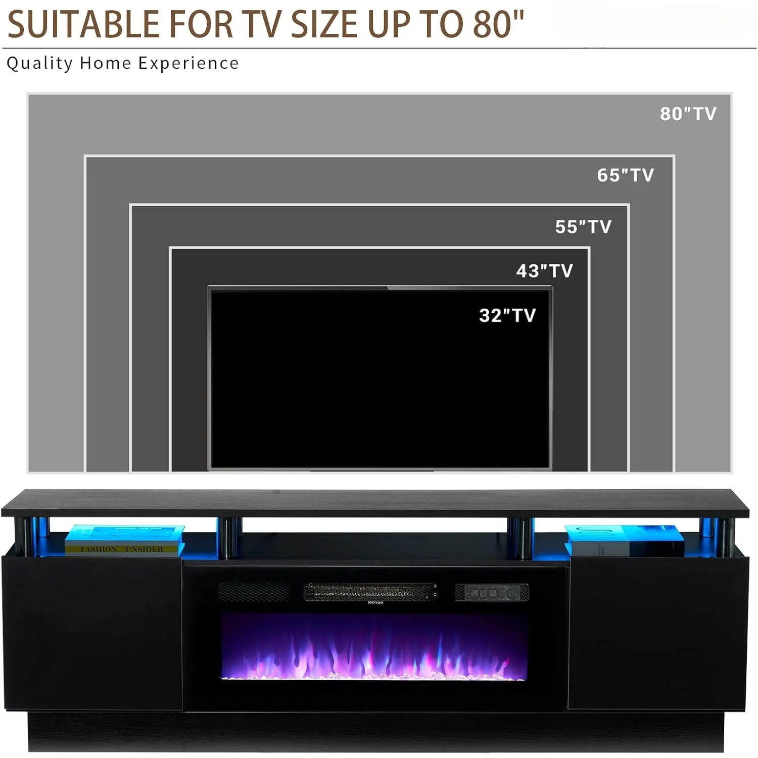70 inch modern electric fireplace TV stand, suitable for TVs under 80 inches, with electronic flame and LED lights, black