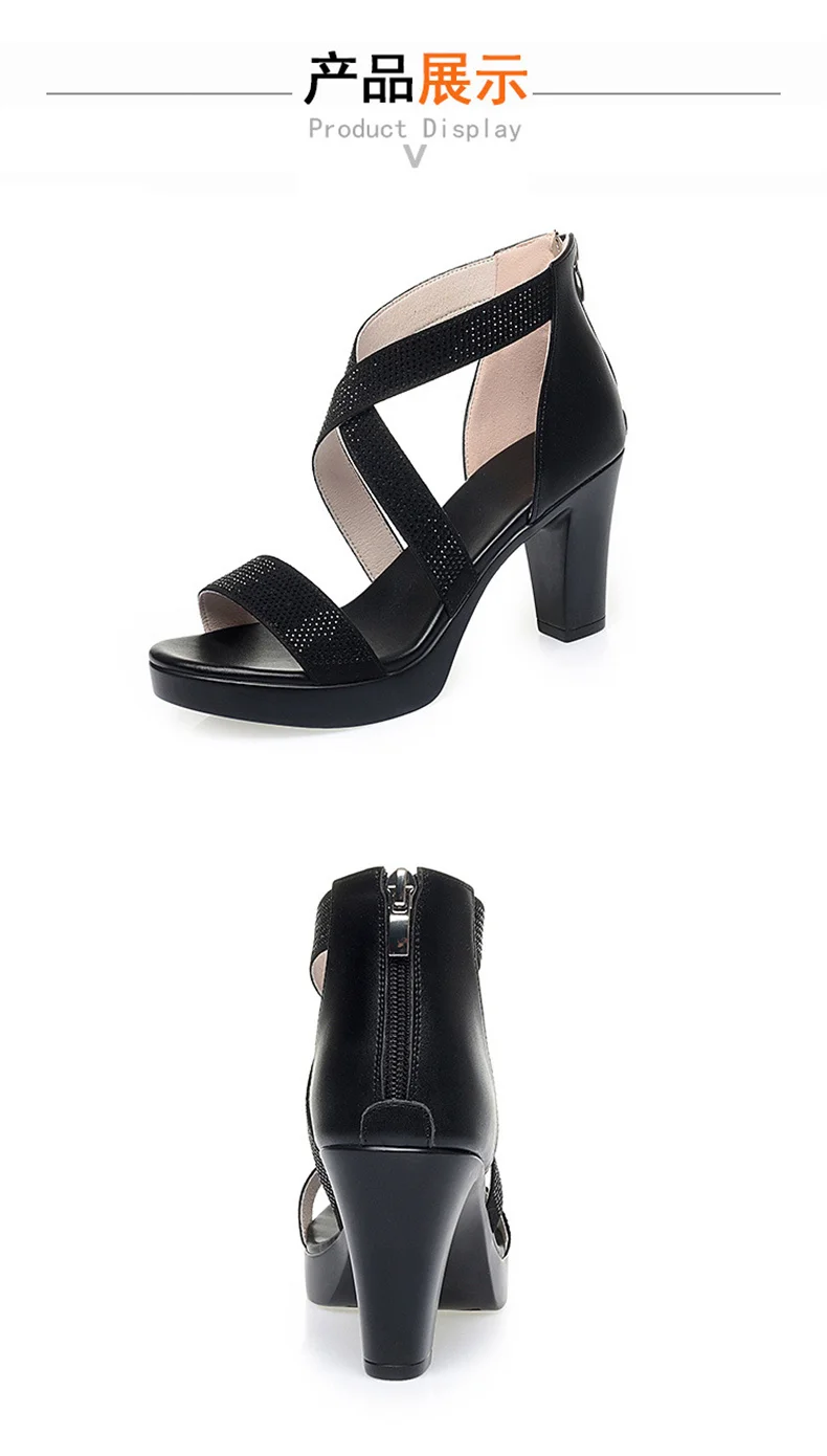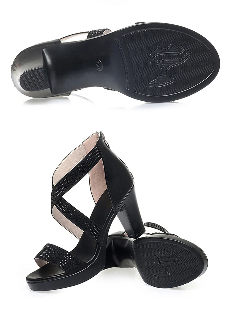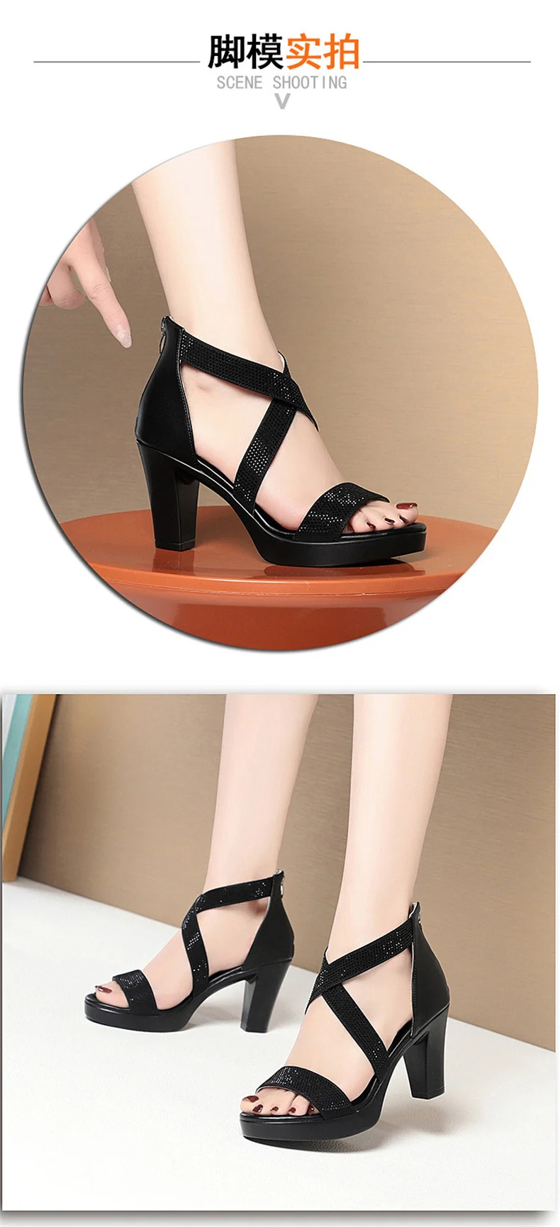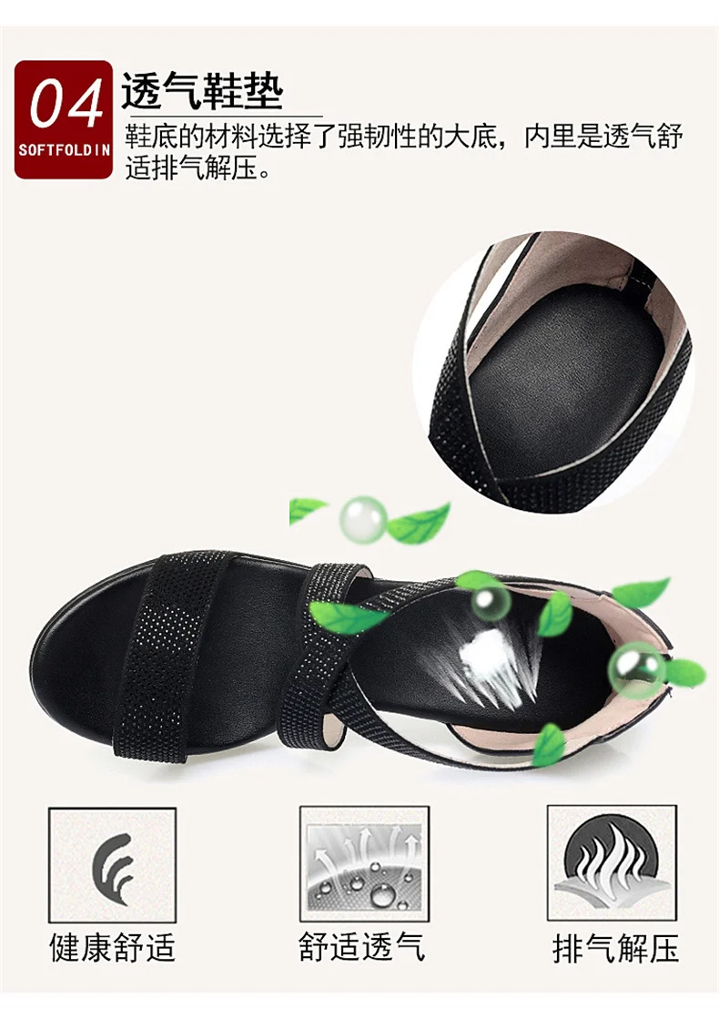 8 cm Woman High Summer Black Rhinestone Glitter Dress Shoes For Soft Leather Platform Wedge Heel Elegant Sandal Roman Style
