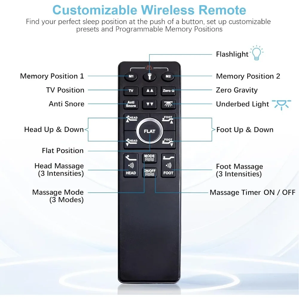 - 【Independent Head&Foot Incline】: Headrests lifts from 0-65° and footrest lifts from 0-45°, different positions are allowed to adjust easily and noiselessly by wireless remote within no time. Preset zero gravity, anti-snoring position increases comfort, relieves pain, and reduces sleep breathing and acid reflux.