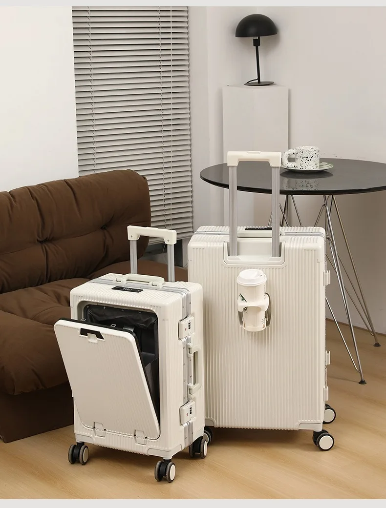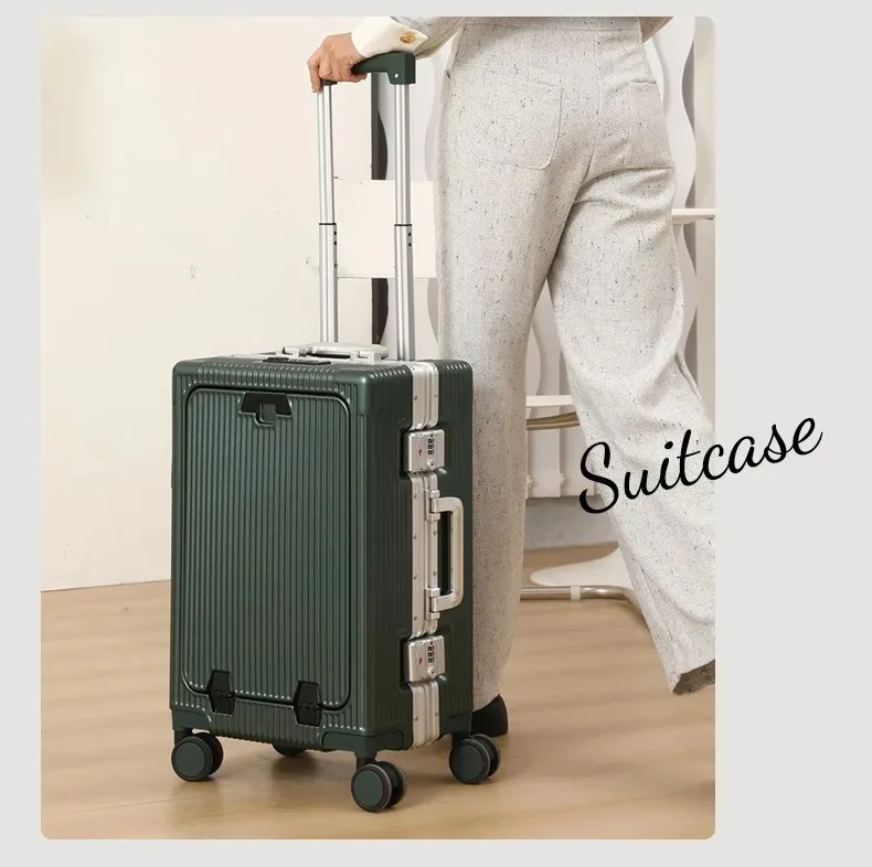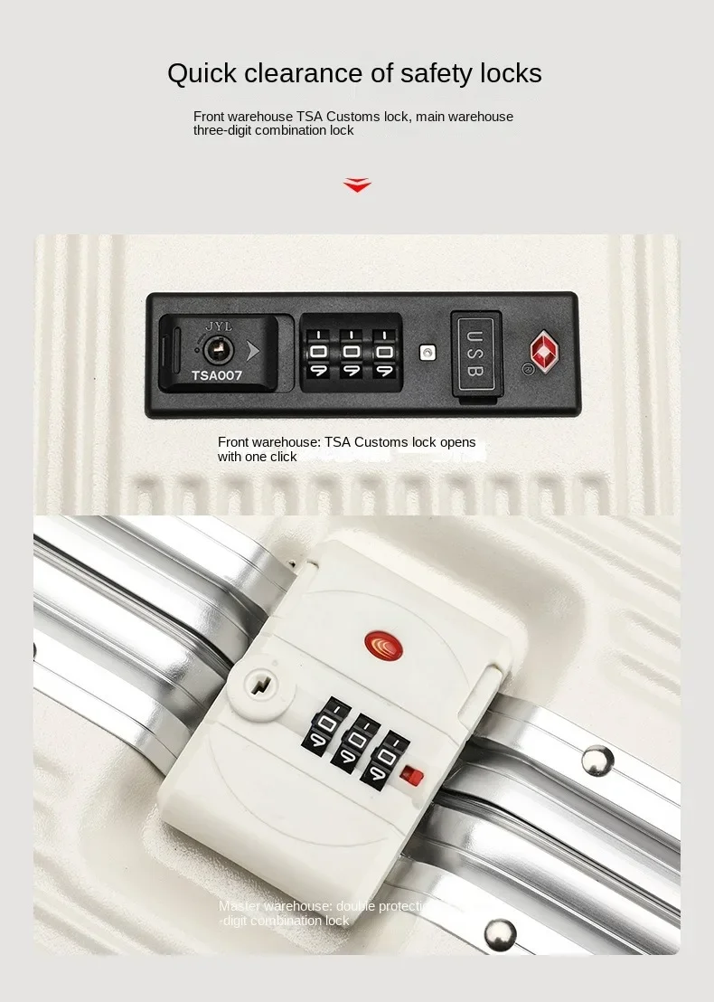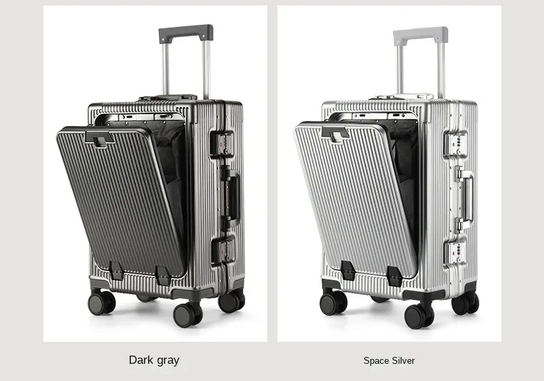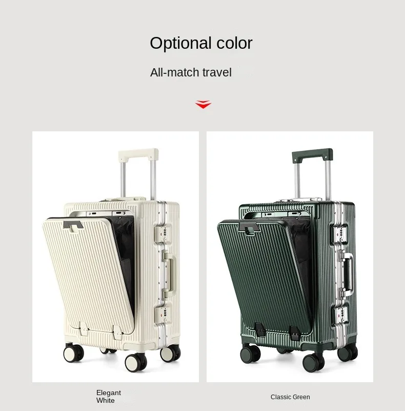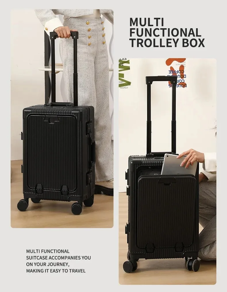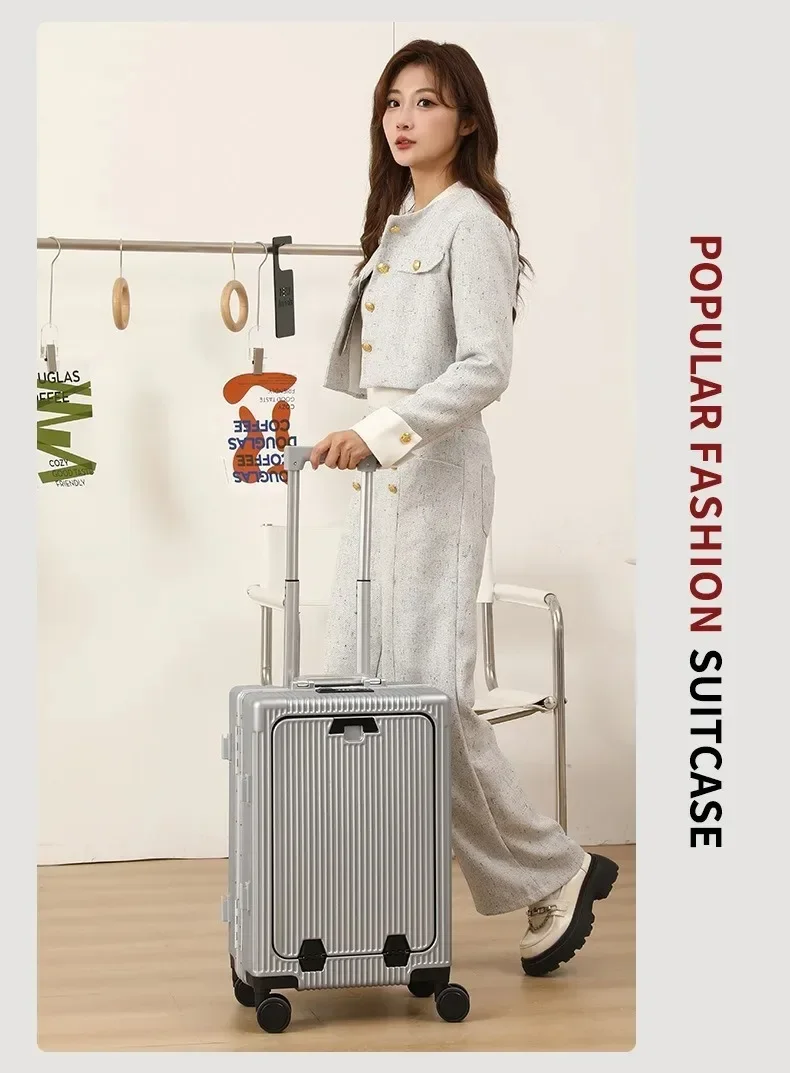 Aluminum Alloy Frame Suitcase Front Opening Pocket with USB Charging Plug Rolling Luggage Trolley Case Bag with Spinner Wheel