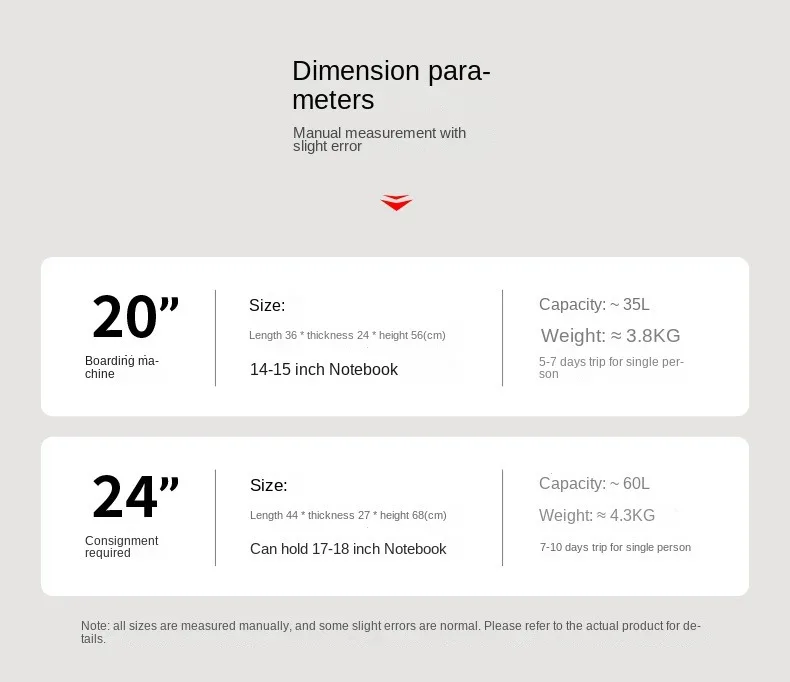 24 inches: 40 * 26 * 65cm. Including wheels [supporting laptops within 15 inches]