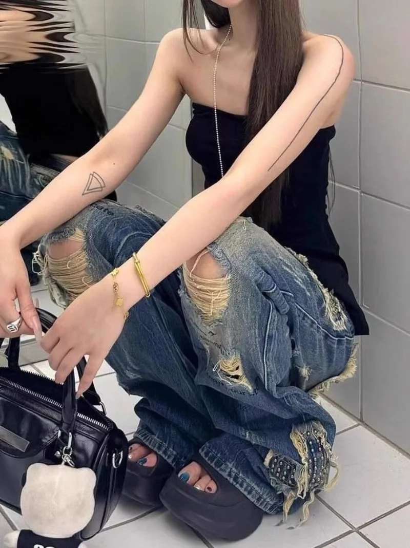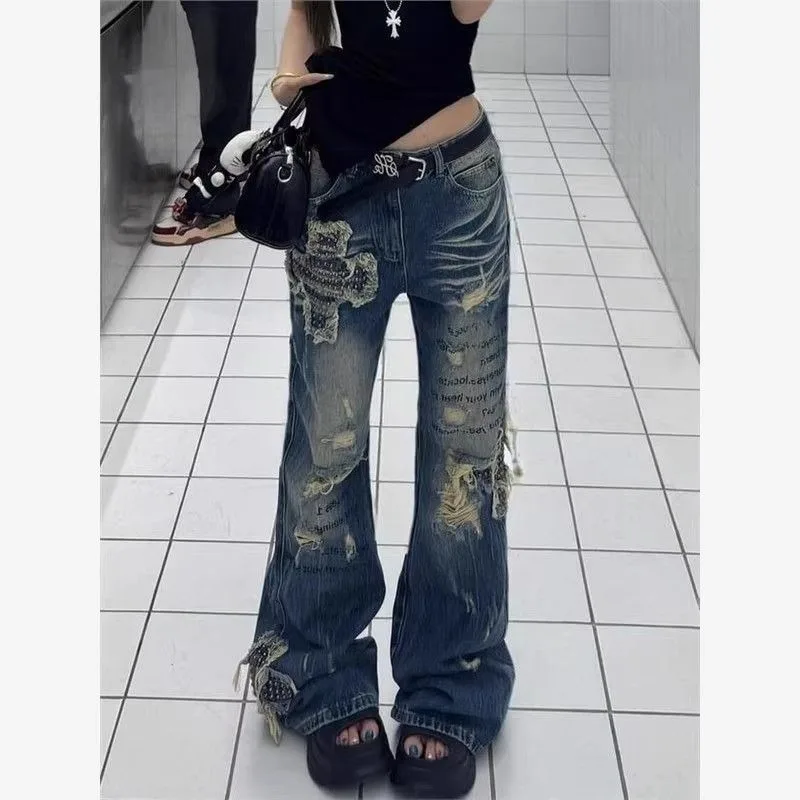 American Vntage Washing Make Old Rivets and Holes Jeans Women Y2K Street Straight Tube Baggy Slim Wide Legs and Long Pants Tide