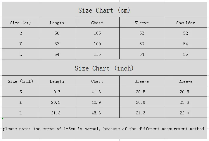 M   :  Length : 52  cm ,  Bust : 109 cm , Sleeve  : 53 cm  ,Shoulder : 54 cm ;