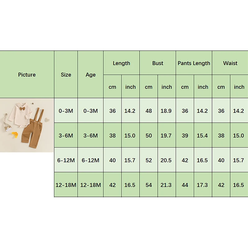 0-3M Rompers Length: 14.17Bust: 18.9 Pants Length: 14.17Waist: 14.17 Advised Age:0-3 Months