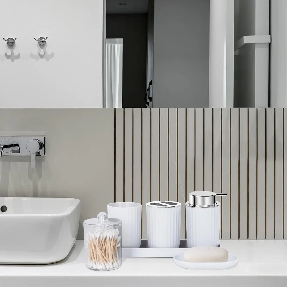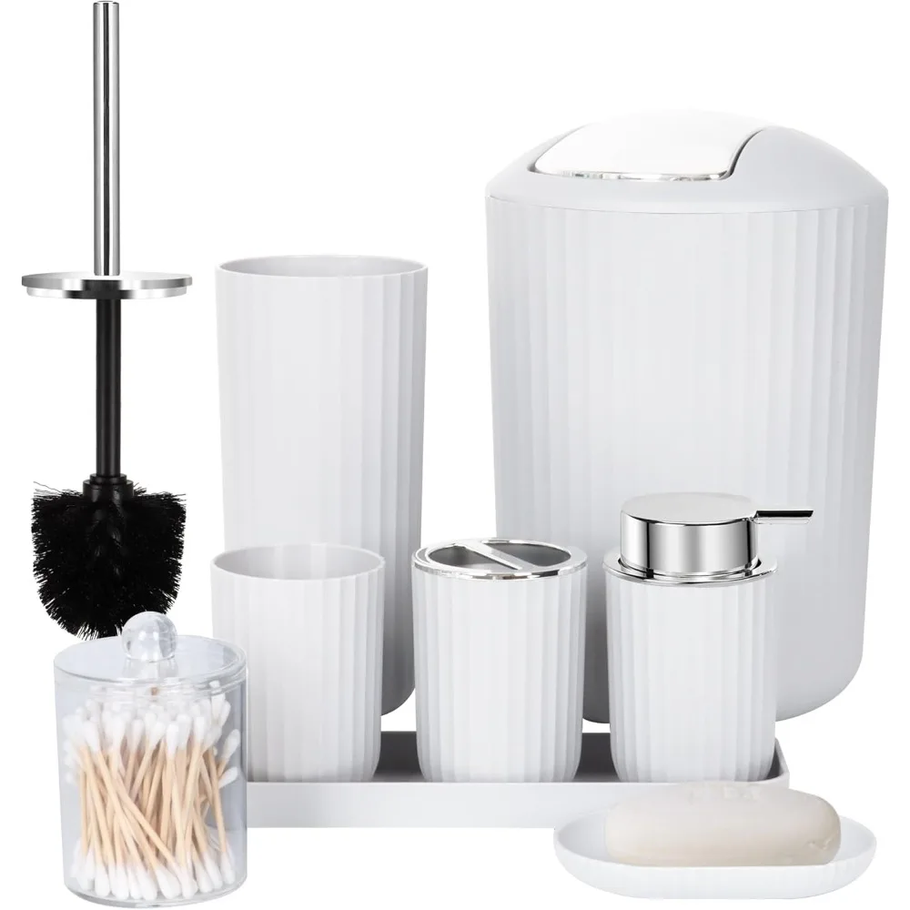 - Multi-function 8 Pieces Bathroom Accessories Set Complete: Includes Soap Dispenser,Toothbrush Holder,Vanity Tray, Apothecary Jars, Bathroom Trash Can, Toilet Brush. Makes the bathroom both well organized and adds a simple textured style.