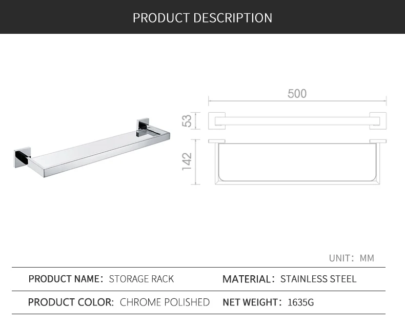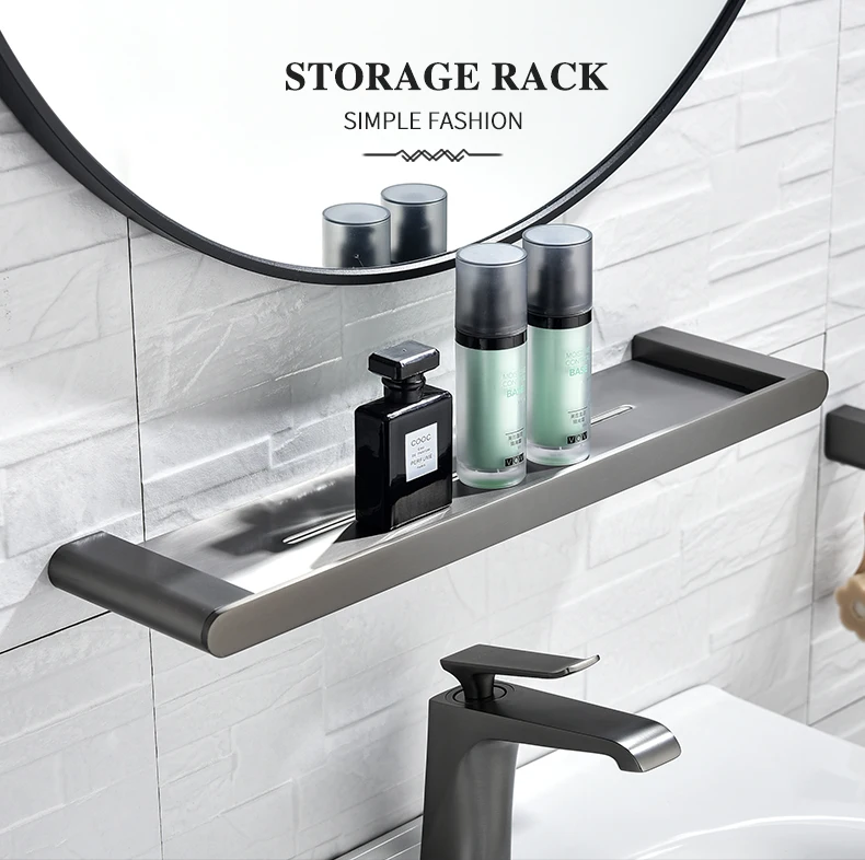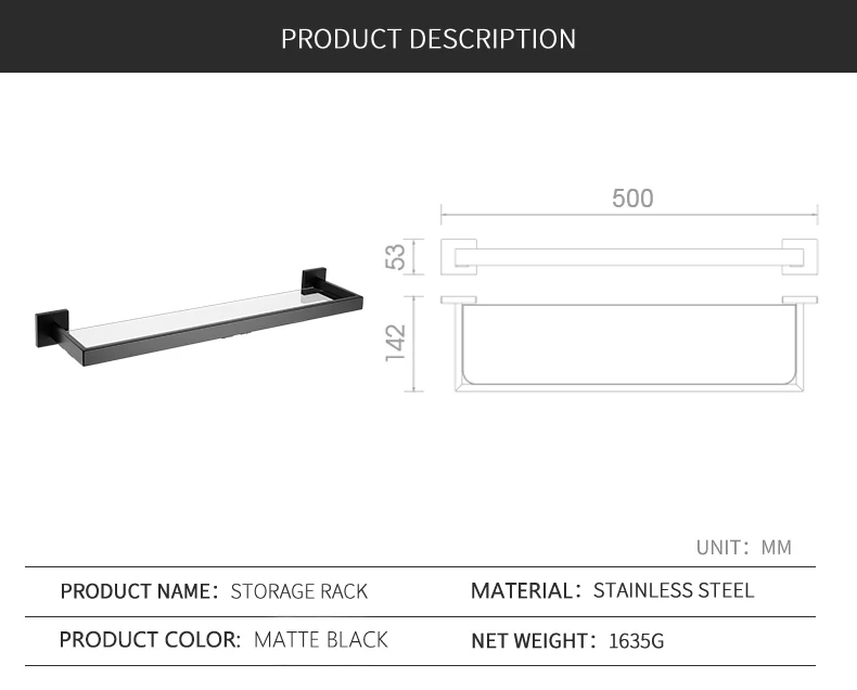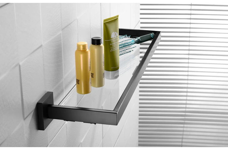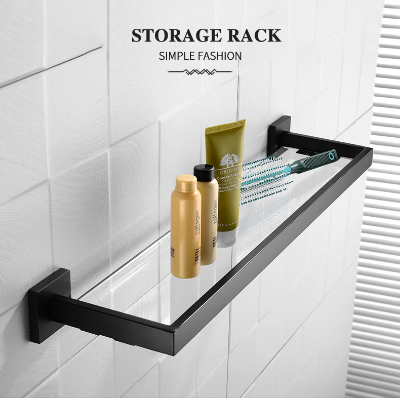 Bathroom Wall Shelf with Rectangle Tempered Glass Stainless Steel Wall Mount Glass Square Shelves Kitchen Organizer Rack Black