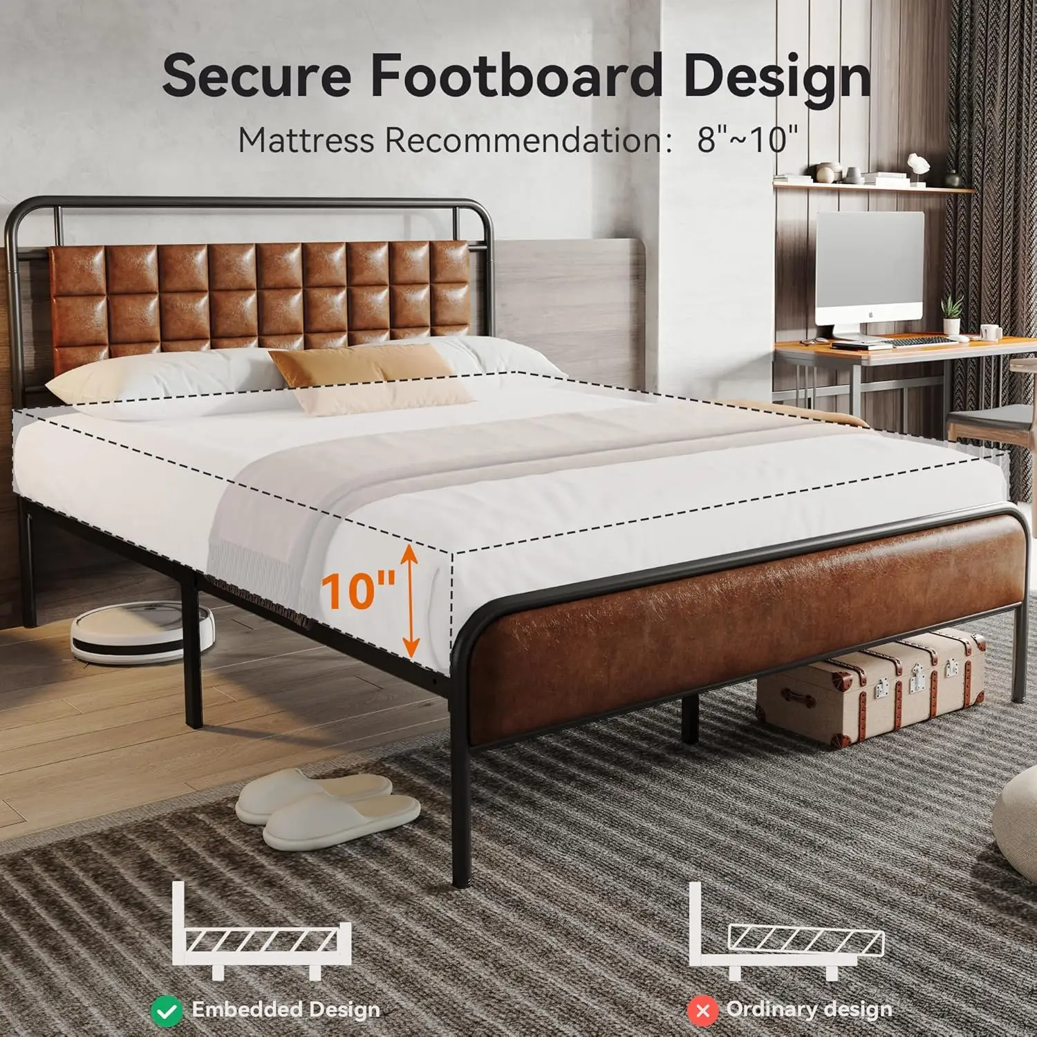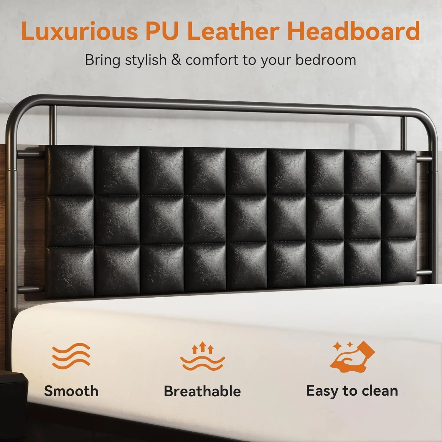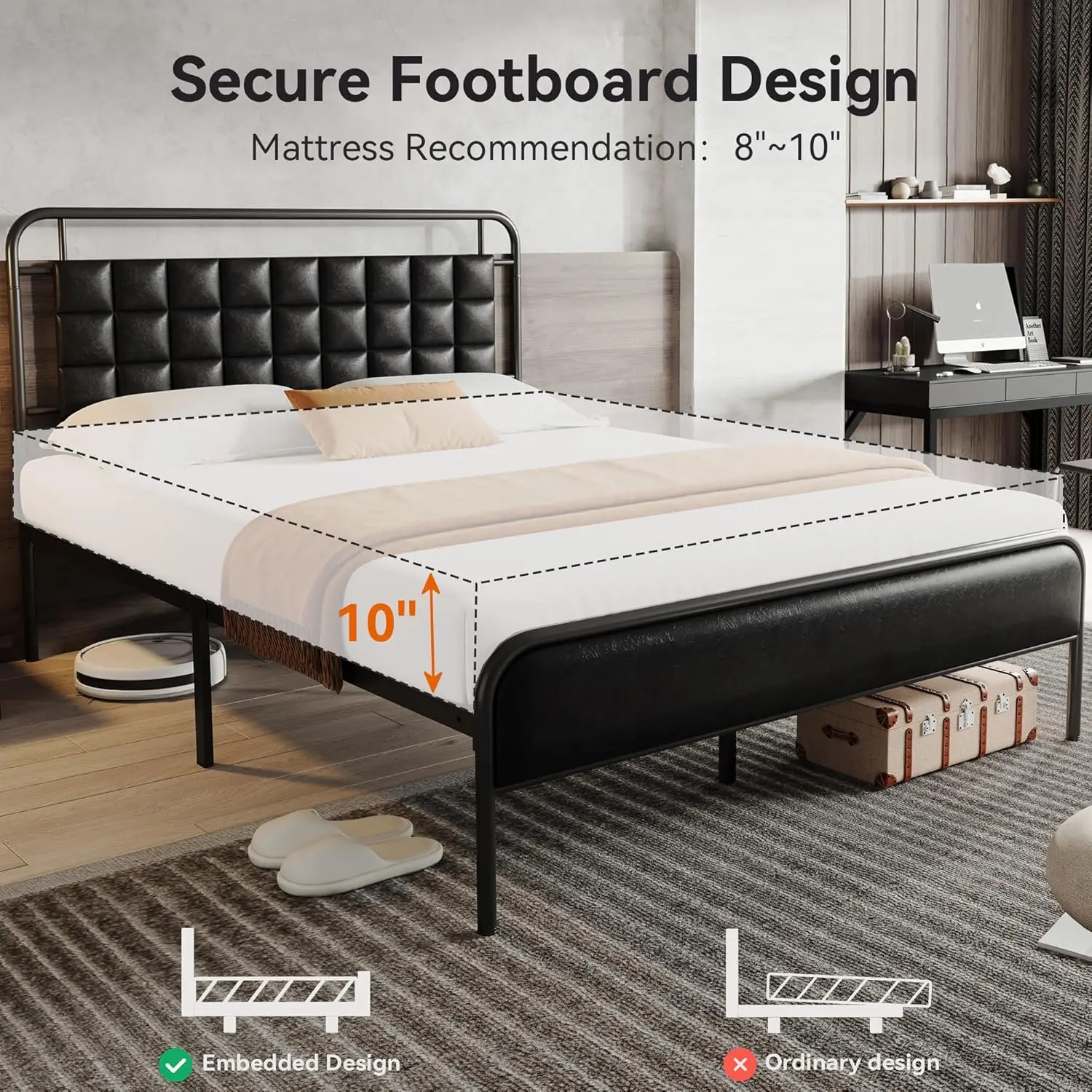 【Stylish Design】The Bedspick queen-size platform bed frame blends industrial chic with modern aesthetics. Its black steel frame paired with a padded faux leather headboard creates a striking visual contrast. The sleek silhouette complements various bedroom styles, instantly elevating your sleep space from ordinary to extraordinary