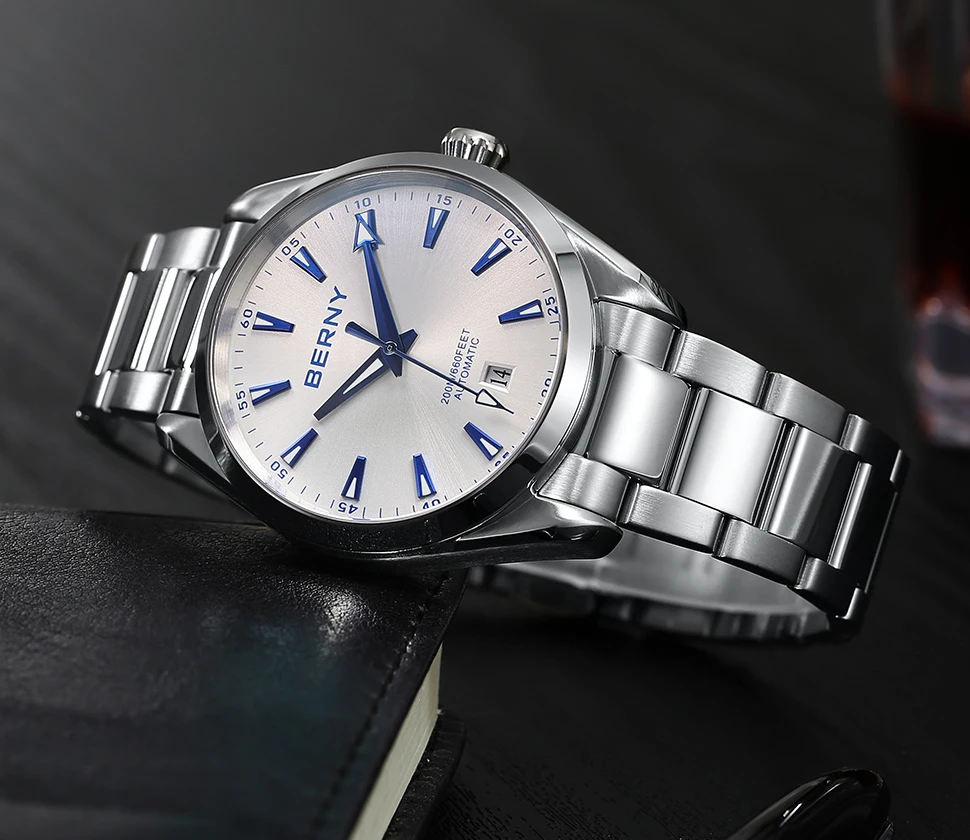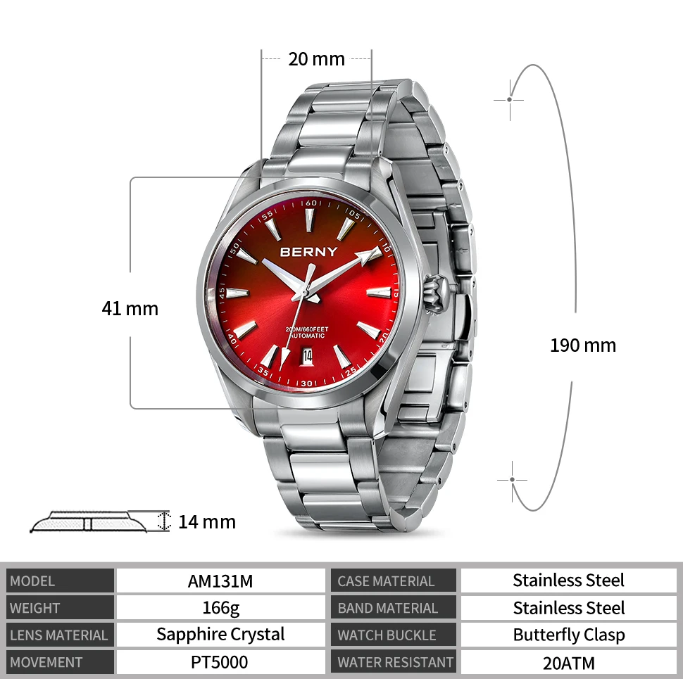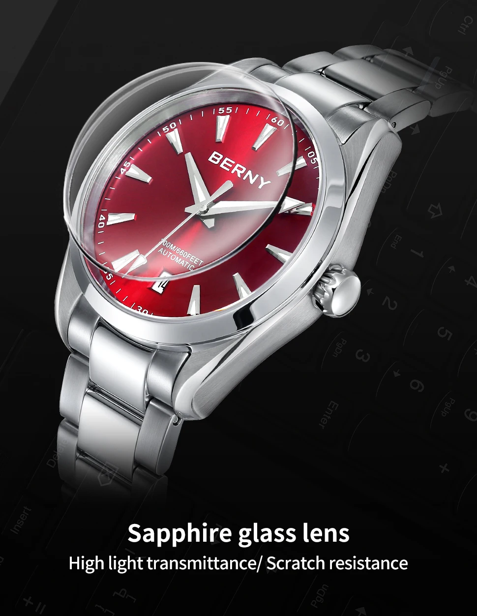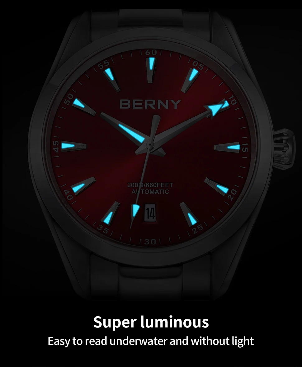 BERNY Men Mechanical Wristwatch PT5000 Automatic Watch For Male Stainless Steel Luminous Sapphire 20ATM Waterproof Mens Watch