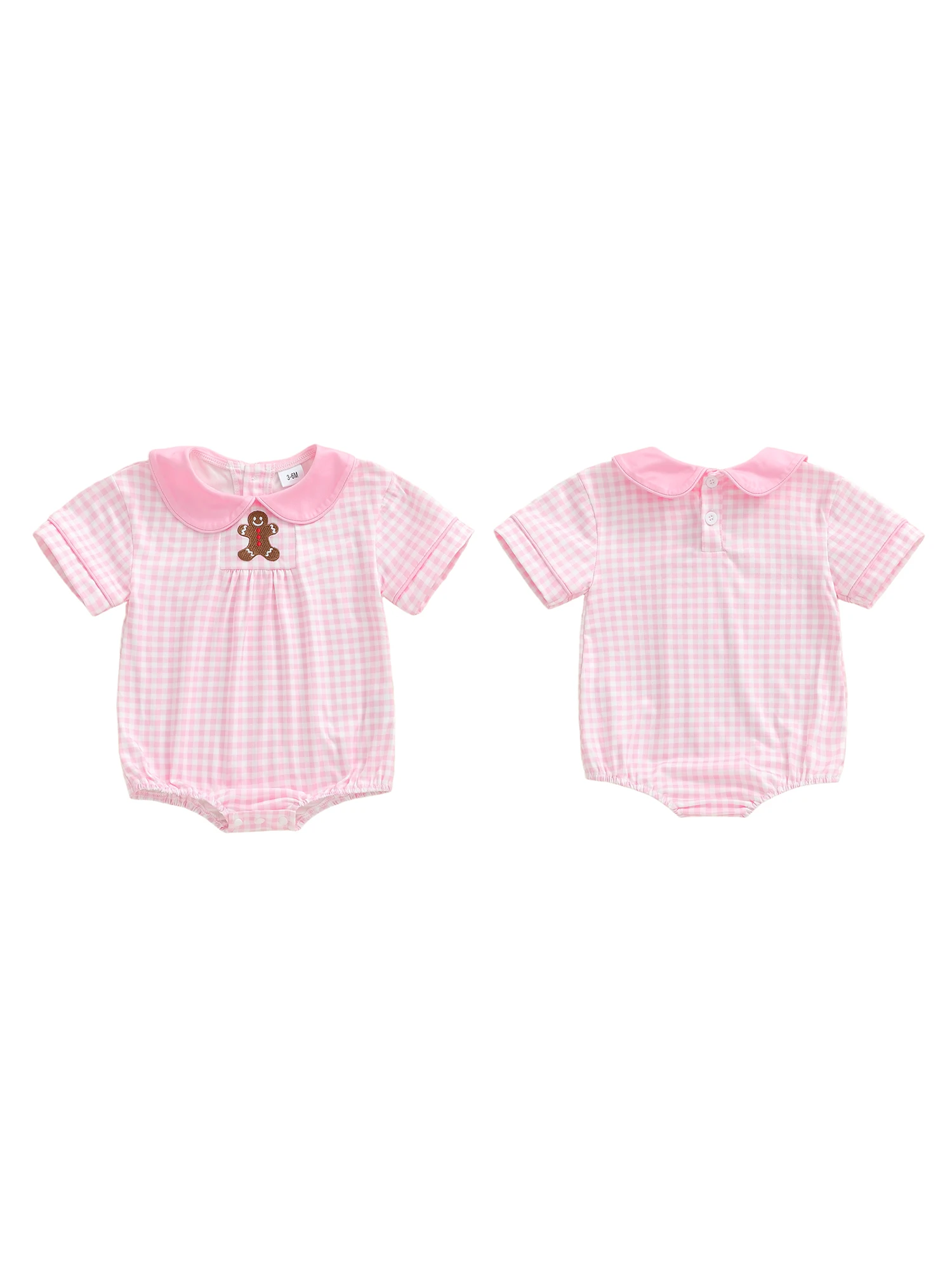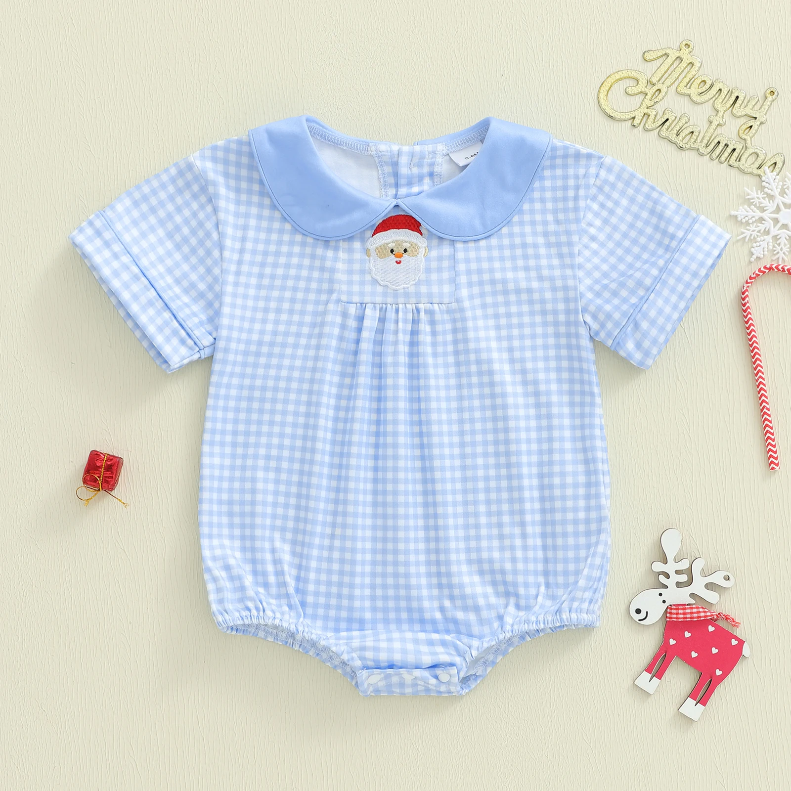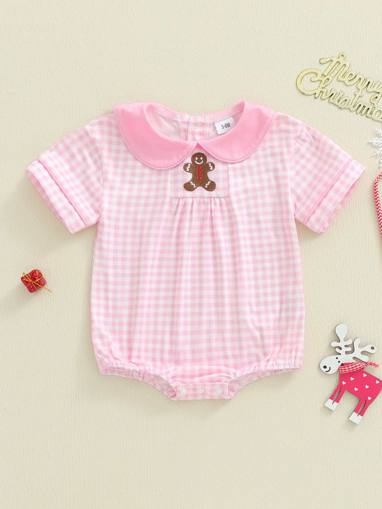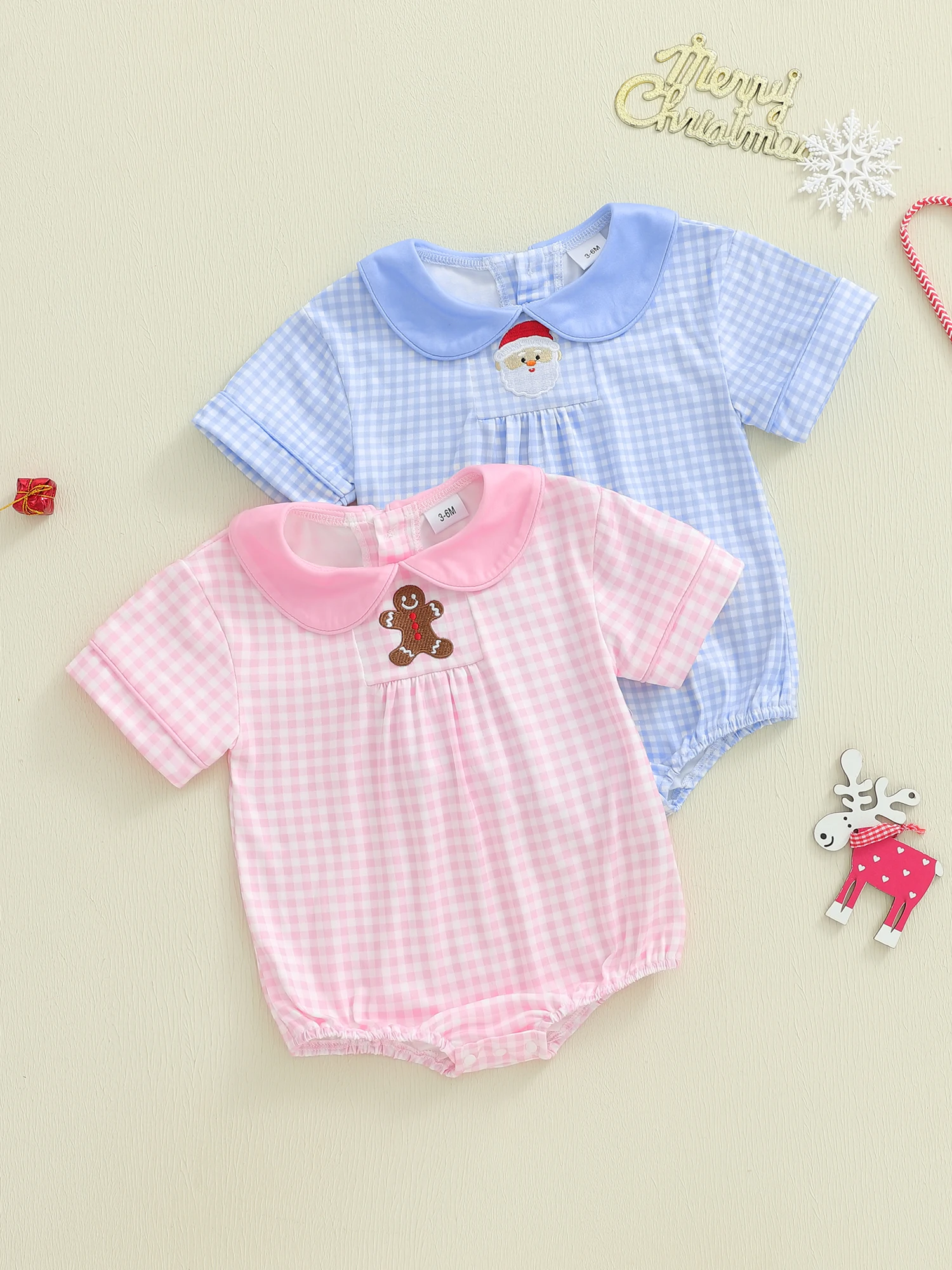 Baby Girl Boy Christmas Romper Plaid Santa/Gingerbread Embroidered Short Sleeve Doll Collar Bodysuit