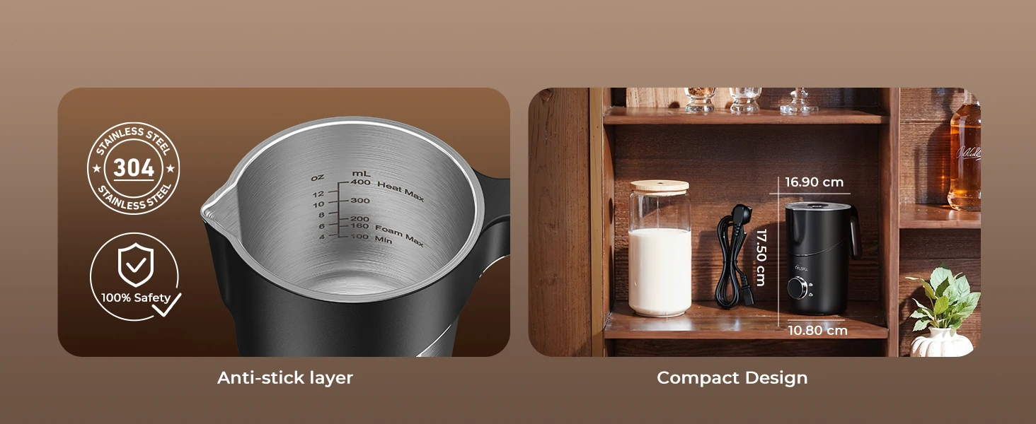 Its compact design makes it easy to store in your kitchen, taking up minimal space while still providing efficient frothing capabilities.