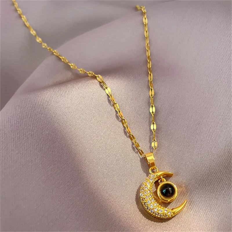 Female Fashion Moon Pendant Necklace Titanium Steel Chain Ladies Jewelry Accessories 100 Languages I Love You