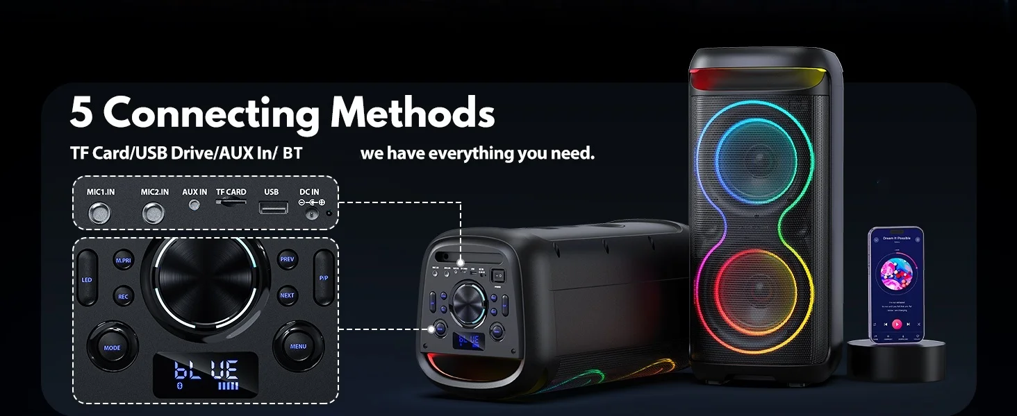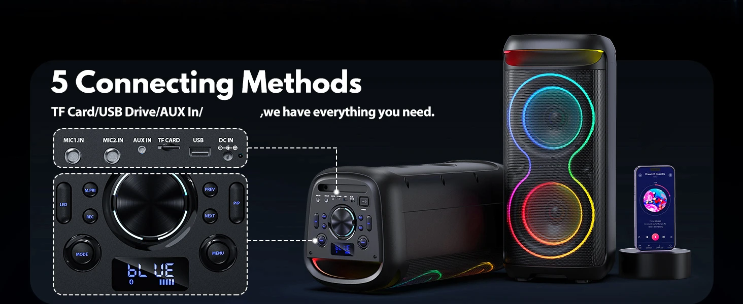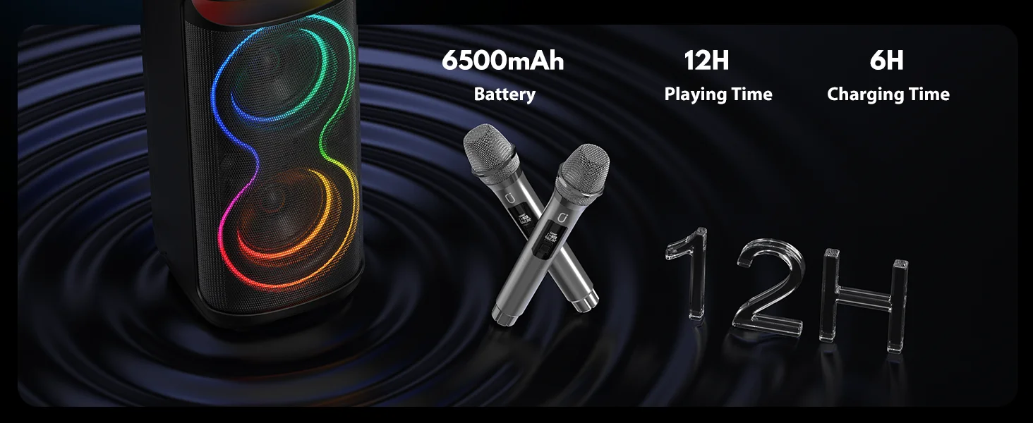 ✿【Colourful Acoustic Lights】- Two acoustic colourful lights are equipped around the speaker units, which change colour and dance to the rhythm of the music. The colourful lights make you feel like you are in a 90s disco floor, setting the mood and lighting up the space for your performance.