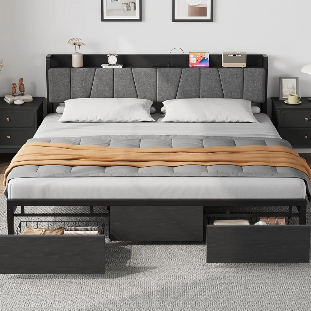 King Size Bed Frame with Storage Headboard, No Box Spring Needed, King Platform Bed with 2 Large Drawers and Charging Station