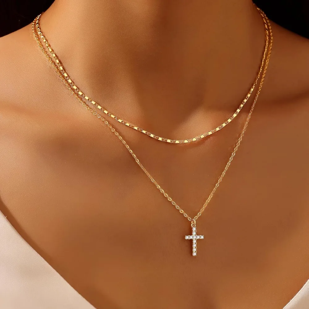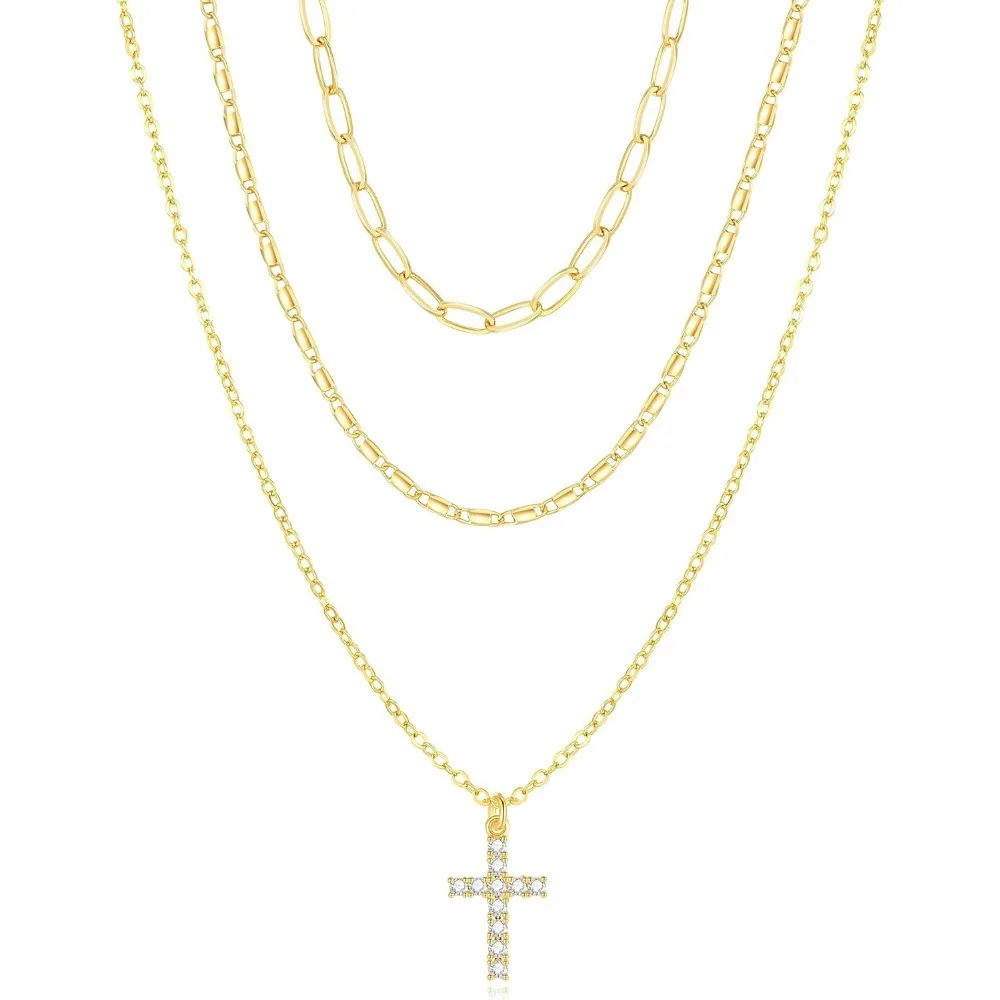 Layered Gold Necklace for Women, Trendy Stackable 14k Gold CZ Diamond Cross Pendant Necklace Jewelry, Paperclip Box Flat Necklac
