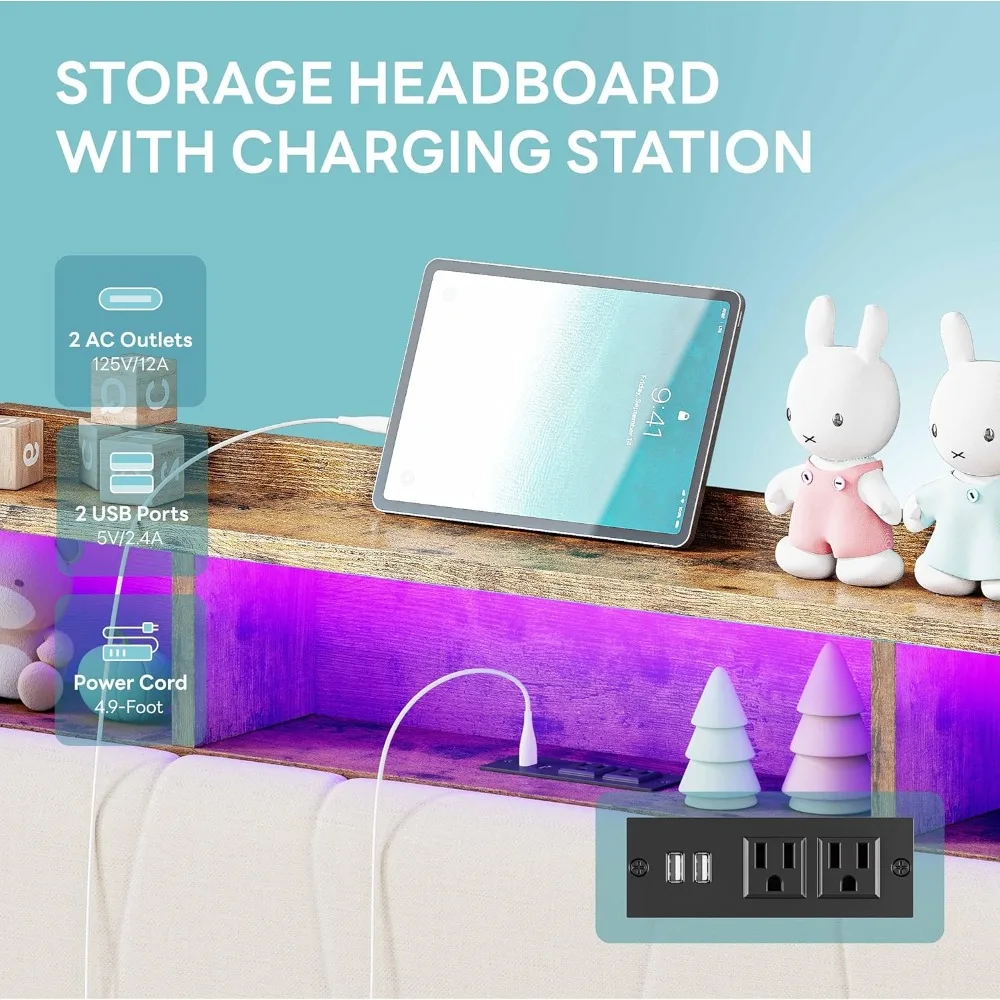 - HEADBOARD WITH STORAGE SHELF & CHARGING STATION: This upholstered bed frame is equipped with a convenient headboard that includes built-in 15W fast charging ports, featuring 2 sockets, and 2 USB ports. This allows for easy charging of electronic devices at any time, making them readily available. The 2 tier storage shelf provides a practical space to place common small items, such as watches or toys, within convenient reach, ensuring easy access and organization