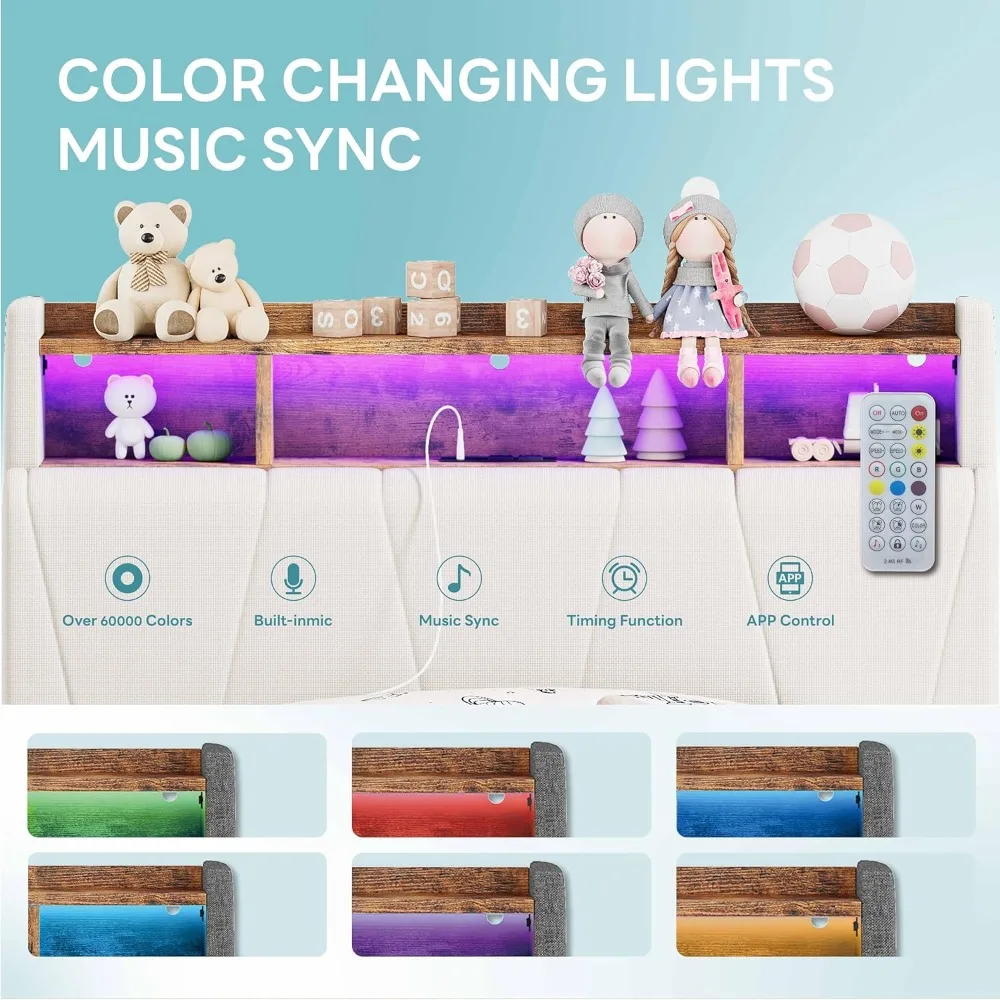 - COZY HEADBOARD WITH RGB LIGHT: This padded headboard provides a cozy surface that effectively supports your head and shoulders while you relax or read in bed. It features a built-in RGB LED light strip with various colors and brightness settings. Easily controlled via remote or app, these lights sync with music, creating a dynamic ambiance