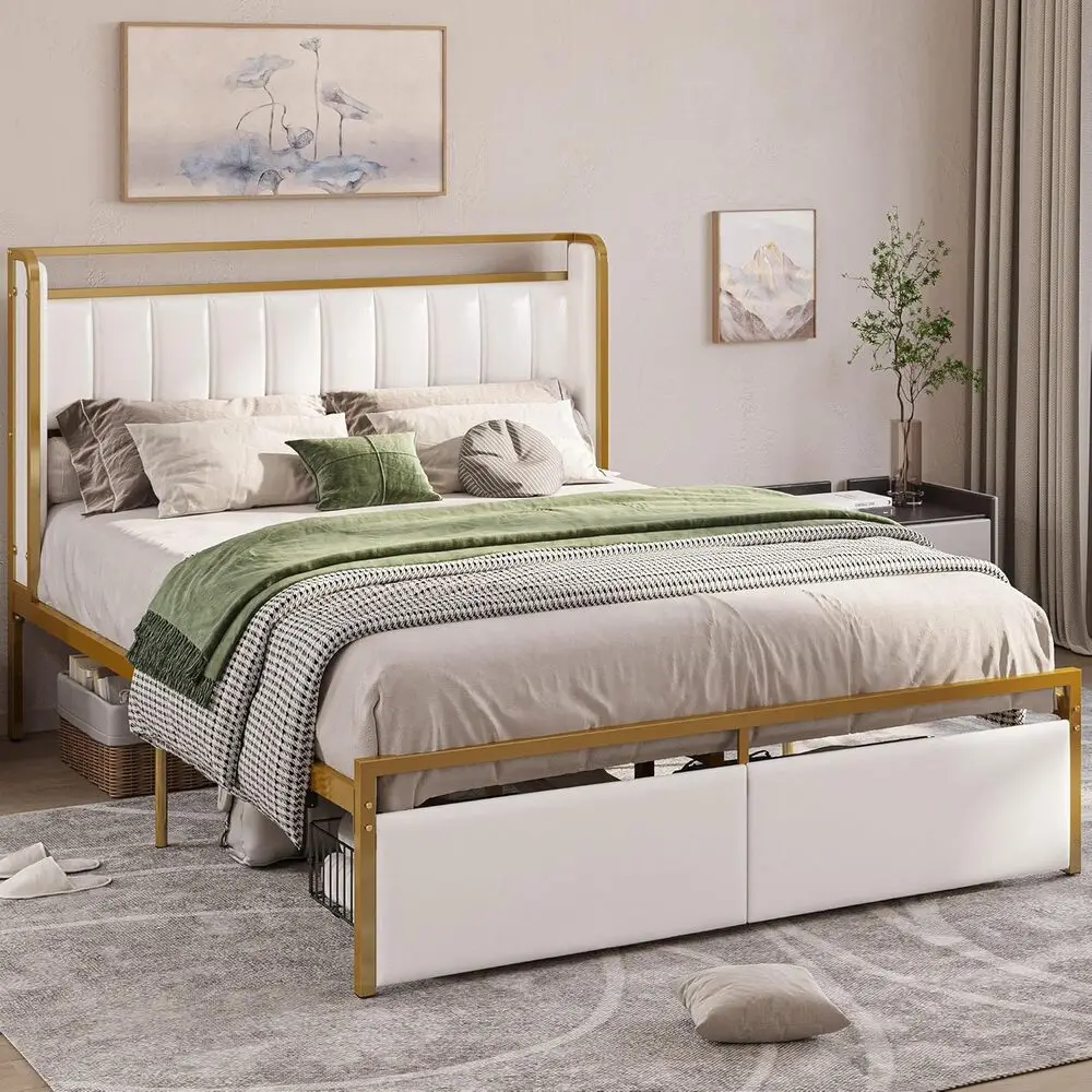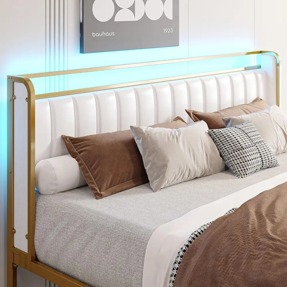 The opulent blend of gleaming golden iron and soft beige-white upholstery creates a stunning, sophisticated aesthetic that adds a touch of luxury and elegance to any bedroom
