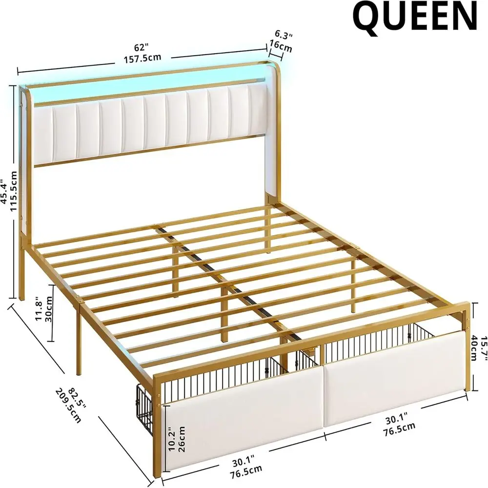 LIKIMIO Queen / Twin Bed Frame with Armrests Headboard & RGB Light, Upholstered Queen Size Bed Platform with Drawers, No Noise