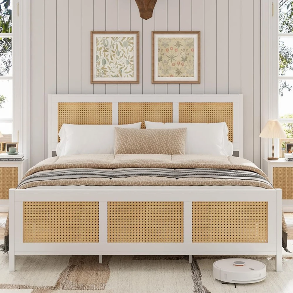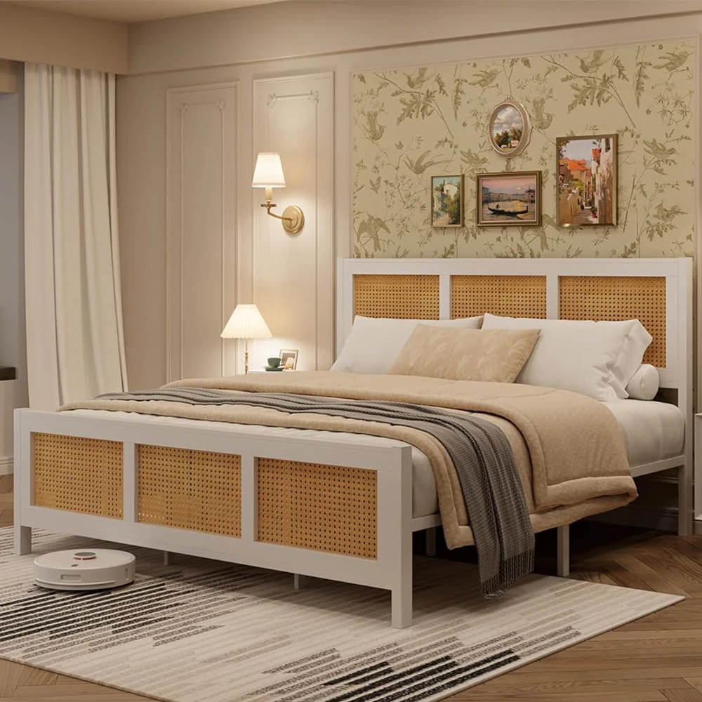 Living Room Bed Frame with Headboard, White Boho Cane Platform Bed Frame with Strong Metal Slat Noise Free No Box Spring Needed