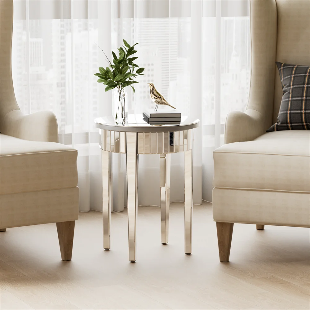 【Sturdy & Stronger】The overall mirrored accent table crafted from MDF board with silver-plated anti-oxidant glassfinish, which offering high reflectivity, enhanced high strength and durability, perched atop four glass tapered legs to ensure its stability, not easy to wobble
