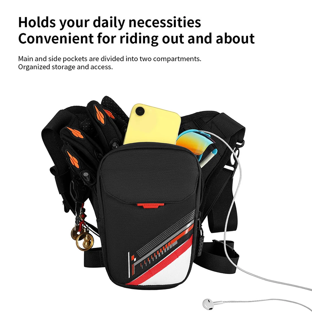 Features: 1.Water-Resistant Protection: The motorcycle thigh bag ensures your essentials stay safe and dry during unexpected downpours, providing peace of mind while traveling. 2.Thickened Ethylene-Vinyl Acetate Cushioning: This motorcycle leg side bag is equipped with a breathable, thickened Ethylene-Vinyl Acetate padding that reduces shock, ensuring comfort without overheating. 3.Spacious Multi-Pocket Design: Featuring multiple compartments, the riding fanny pack offers ample space for organizing your belongings efficiently. 4.Reflective Safety Accents: Stay visible and safe at night with the reflective elements integrated into this motorcycle crossbody bag. 5.Adjustable Fit for Everyone: The multifunctional waist bag boasts an adjustable design, making it suitable for most people and various activities. Specification: Main Material: Polyester Color: Red White Black Backpack Body Size: About 20cm (7.87in)*15cm (5.91in)*8cm (3.15in) Net Weight: About 280g
