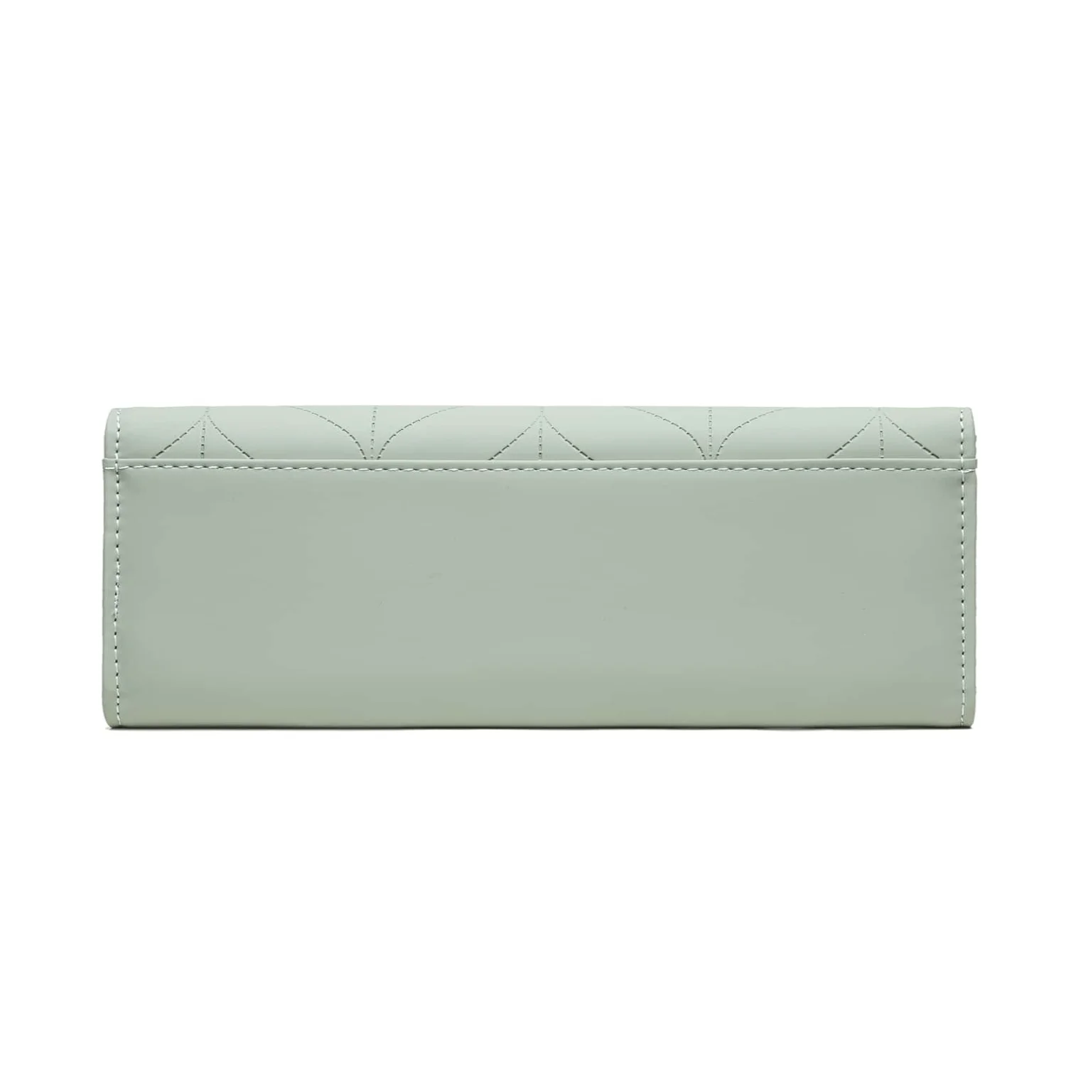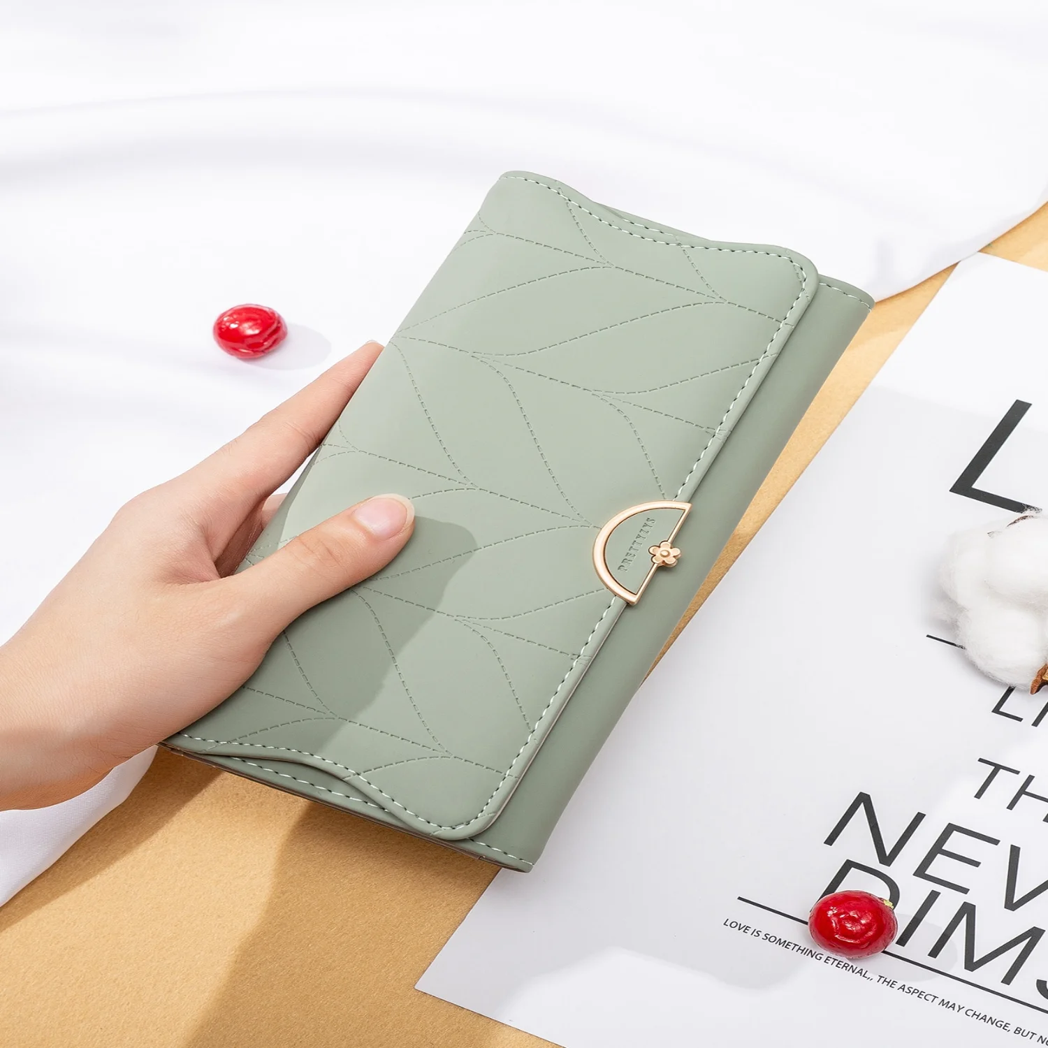 1. Stay organized and stylish with this minimalist metal decor long wallet and checkbook cover. Perfect for a business professional or teacher on the go. Features a sleek V closure buckle in a trendy green color.