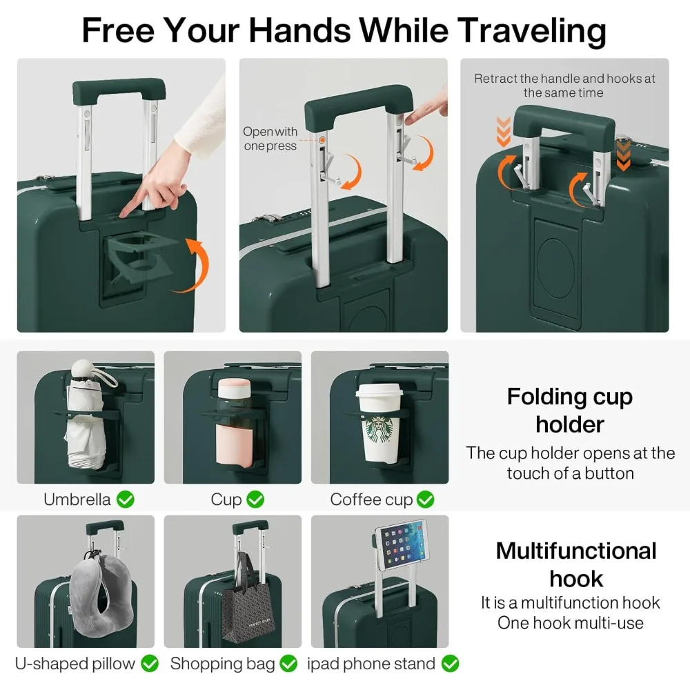 • 【Multifunctional Holder Design】Especially designed water cup holder, phone holder located in top of luggage and the handle hook. If you enjoy drinking coffee or playing with your phone while traveling, it will be the perfect choice