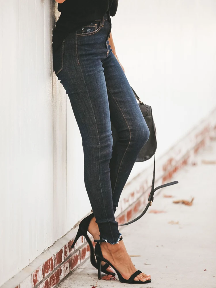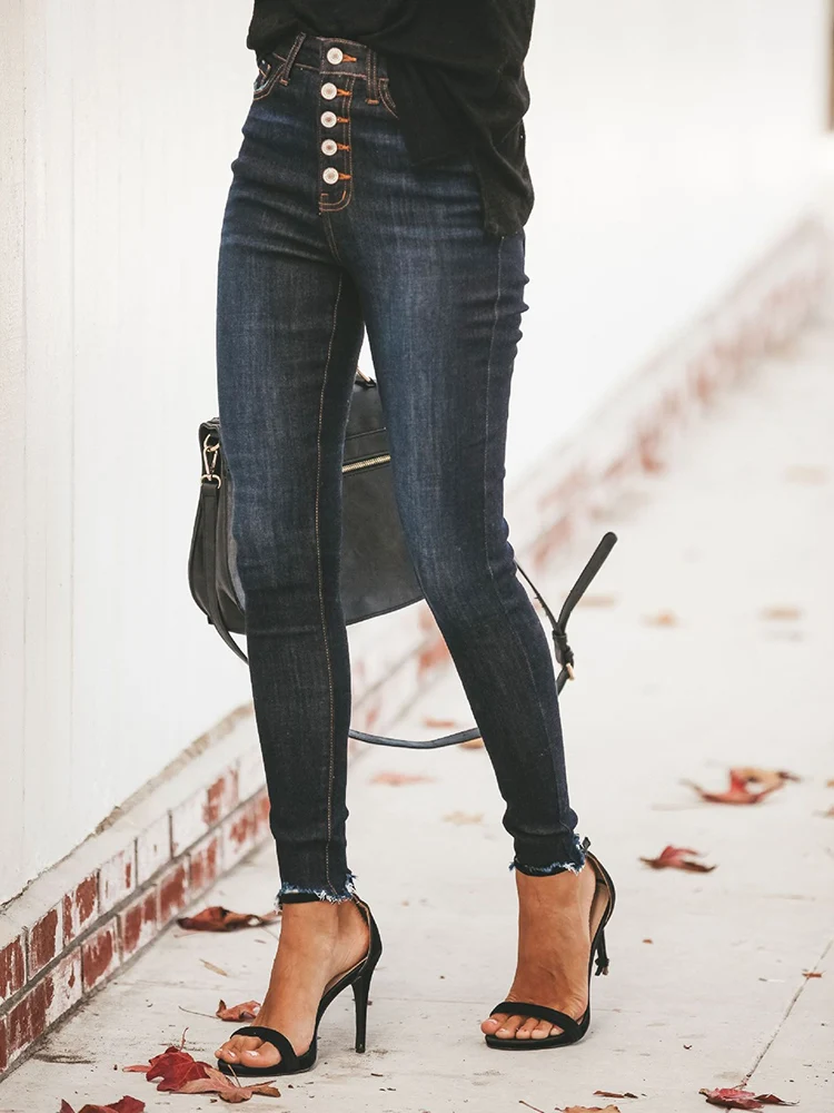 New Girls Stretchy Simming Button Jeans Lady High Waist Vintage Blue Pencil Pants Narrow Straight Leg Casual Streetwear Trousers