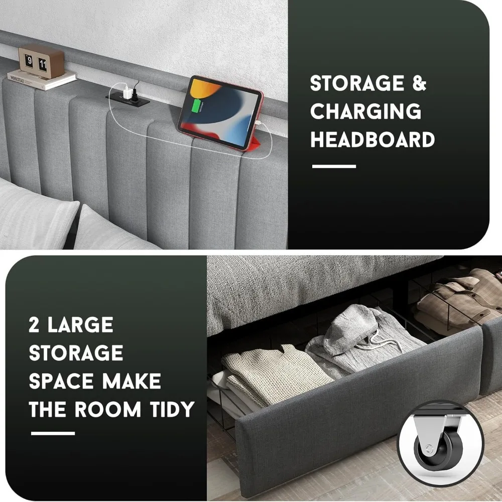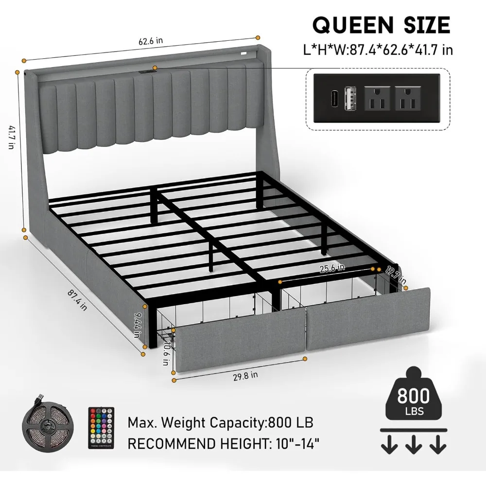 Queen Bed Frame with Headboard and 2 Storage Drawers, Platform Bed Frame Queen Size Upholstered with LED Lights and Charging Sta