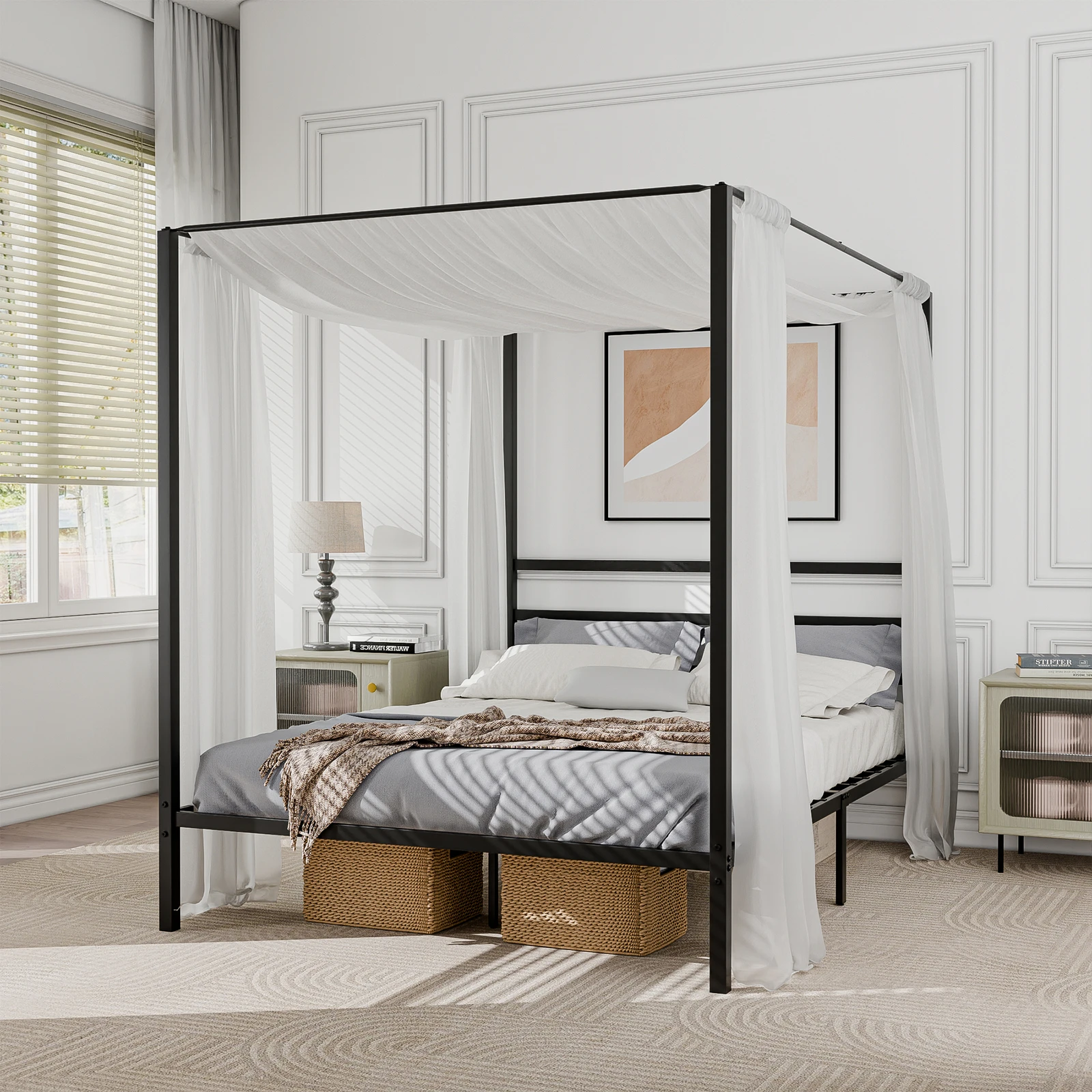 Queen Size Canopy Bed Frame with Headboard Bed Metal Slat No Box Spring Needed