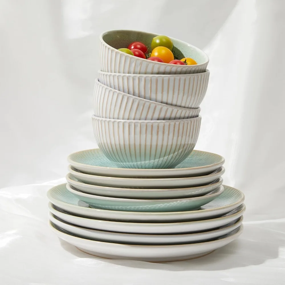 This 12-piece ceramic dinnerware set boasts a modern and elegant embossment design, making it a standout centerpiece at any table setting. The pebble-like textured glaze adds a touch of sophistication and beauty, while the durability ensures it's suitable for everyday family meals as well as special occasions like dinner parties and events. Ideal for weddings and housewarming gifts, this set is a perfect blend of style and practicality. Made from degradable clay, these dishes are lead and cadmium-free, providing a healthy and superior value. The premium stoneware is fired twice, resulting in a sturdy, durable, and chip-resistant product designed for long-lasting use. The unique round shape allows for easy stacking and space-saving storage, while the glossy finish on the inner side of the plates and bowls is both scratch-resistant and resistant to damage during stacking or daily use. These dishes, with their beautiful glaze and elegant design, make for an excellent gift option for various occasions including housewarming, Thanksgiving, and Christmas. We at Pokini are committed to providing top-notch customer service and support. If you encounter any issues, please don't hesitate to reach out to us. We stand by our products with professionalism and a dedication to customer satisfaction.