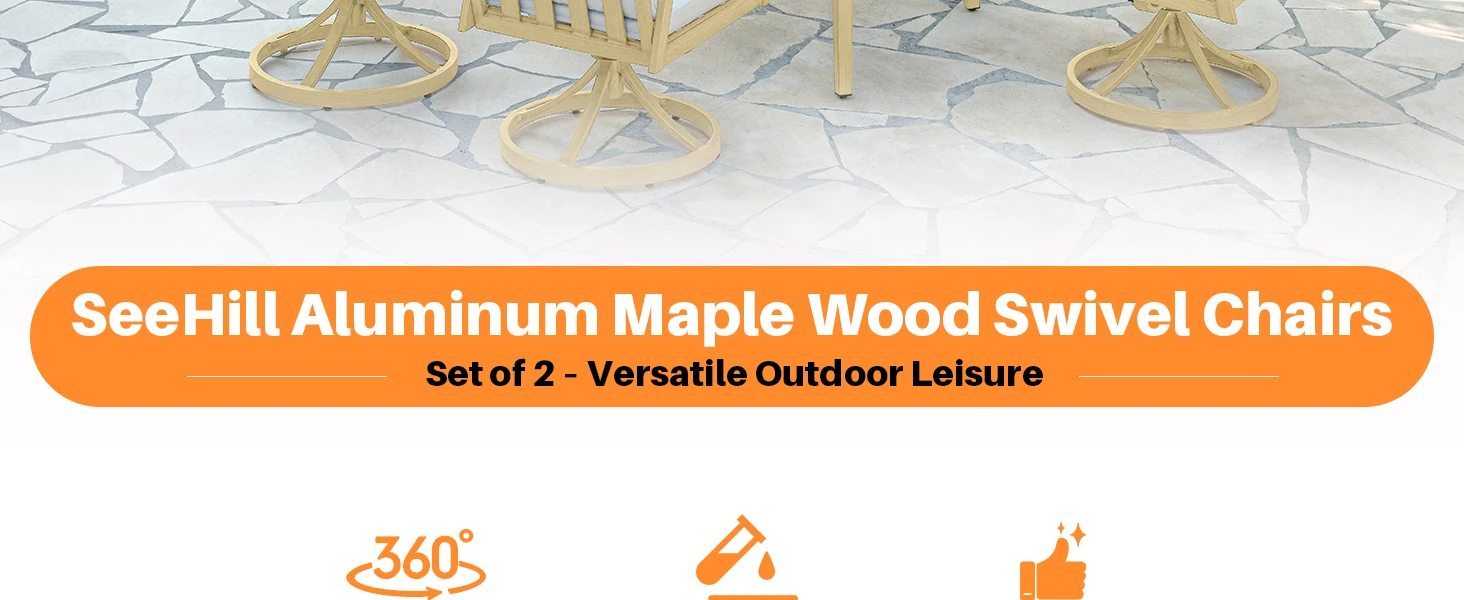 SeeHill Swivel Patio Dining Chairs, 2 Aluminum Swivel Chairs with Cushions, 360° Rotation, Maple Wood Outdoor Furniture