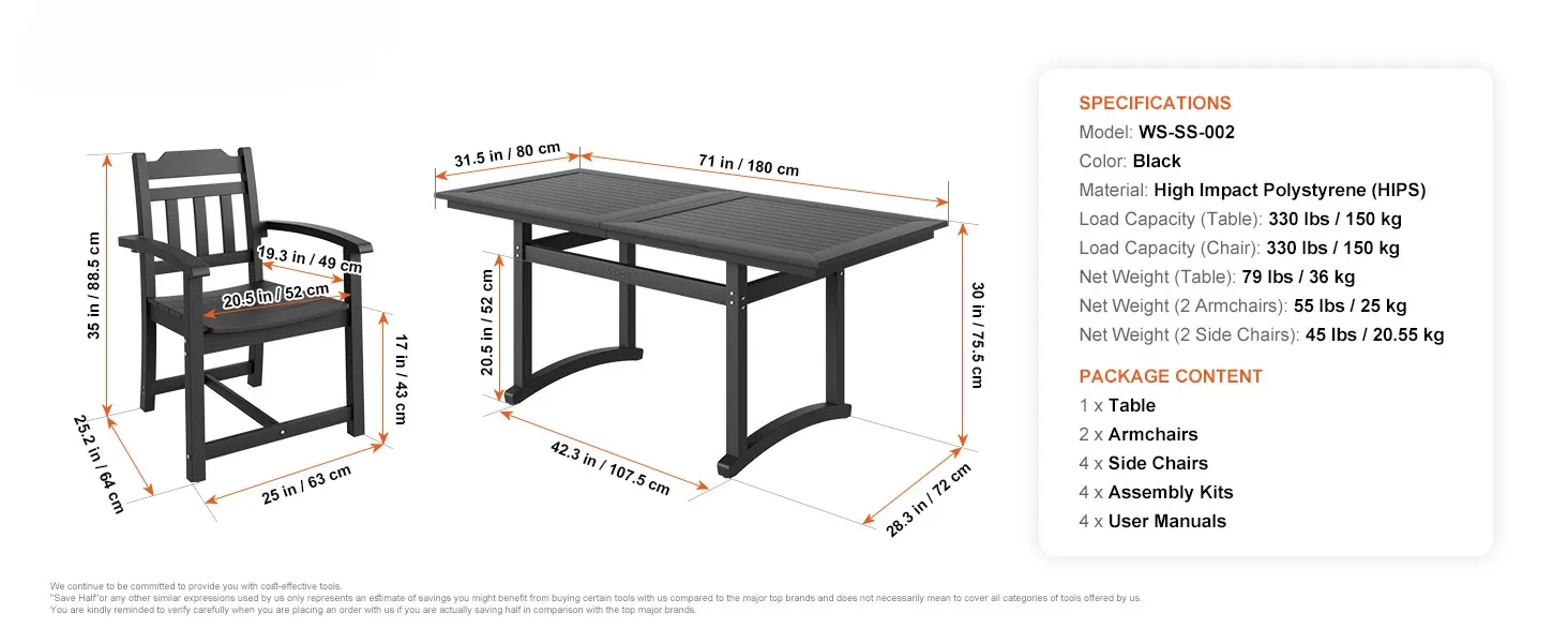 Enjoy Simple Assembly: Assembling your dream outdoor dining area has never been easier. We have taken care of the logistics, dividing the set into 4 packages for your convenience (1 table in 1-package, 6 chairs in 3 packages) , ensuring a hassle-free and straightforward assembly process.
