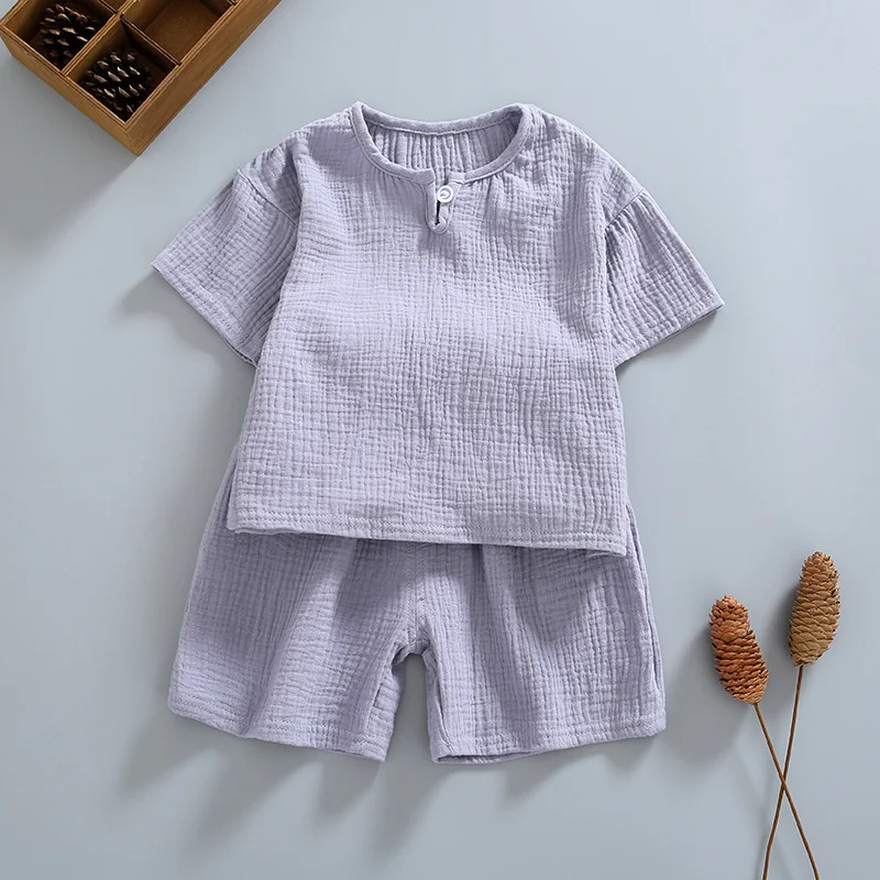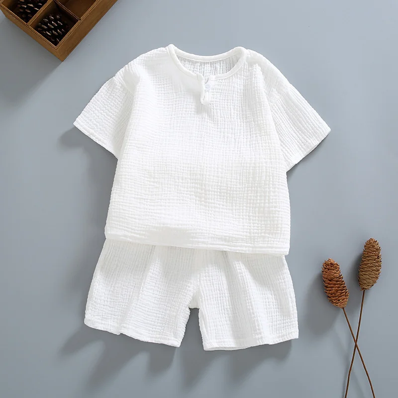 Summer Clothing Sets Organic Double Gauze Cotton Home Wear Kids Clothes Suit Summer Kids Pajama Short Sleeve Shorts Suit White