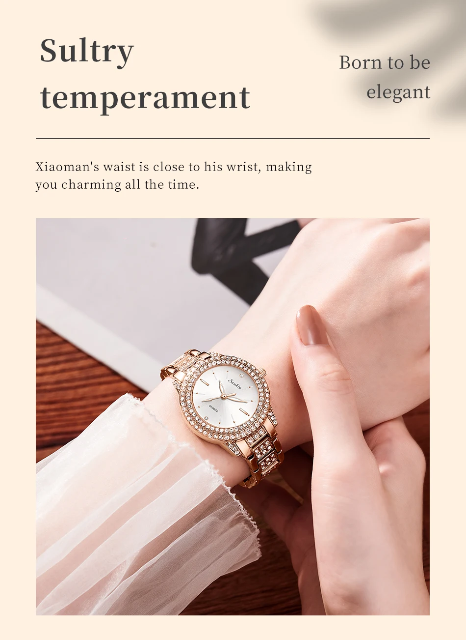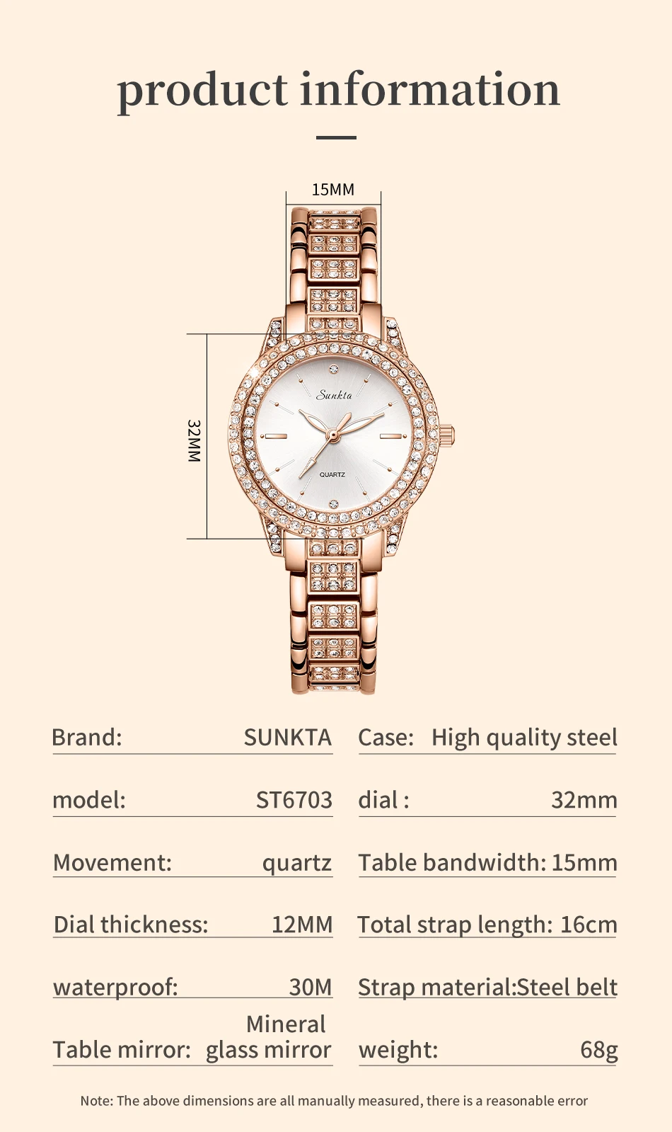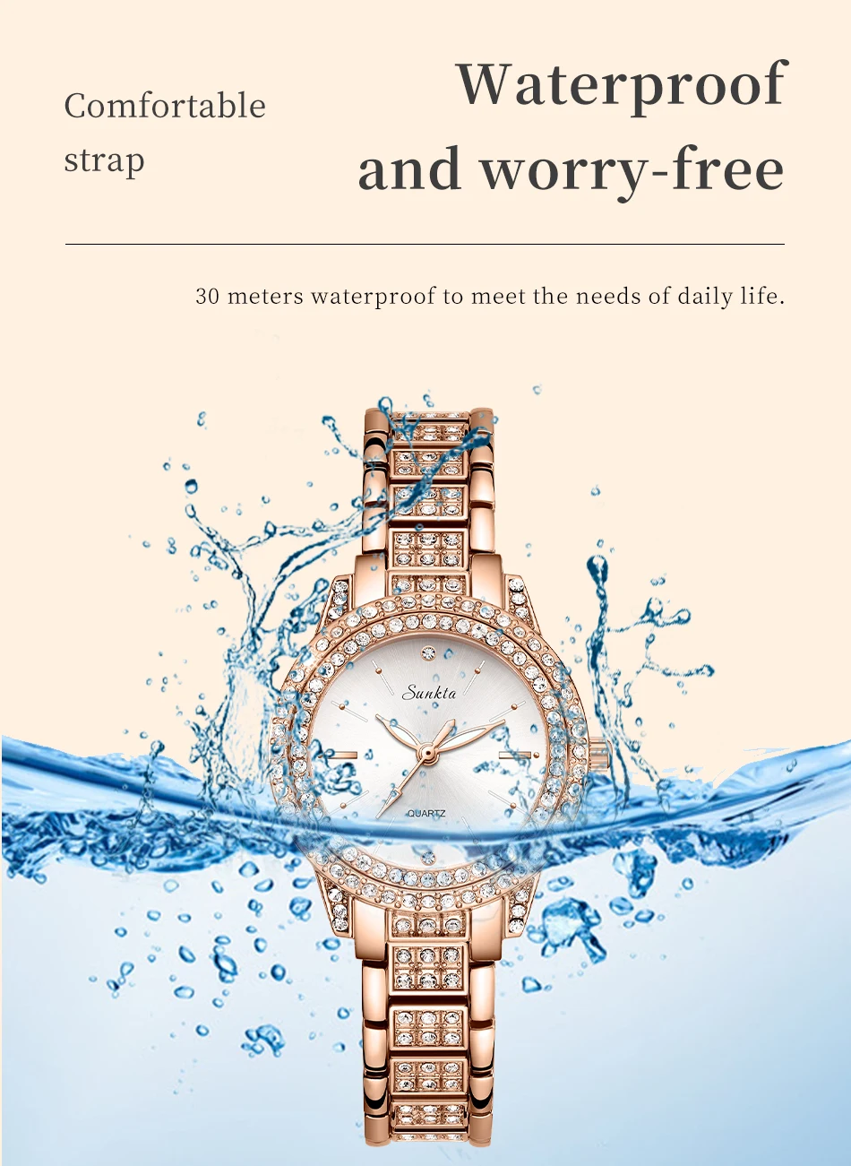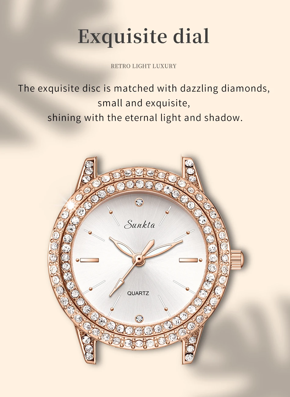 SUNKTA Women Wristwatches Relojes Para Mujer Luxury Classic Golden Watch Women Alloy Strap Round Rhinestone Dail Quartz Watches