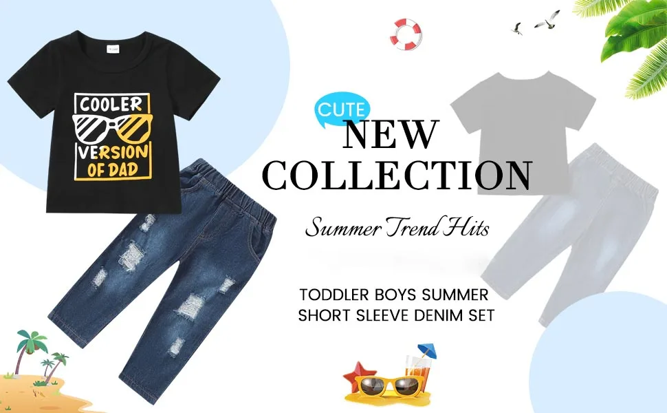 ❤ Toddler Boy Summer Outfits Fashionable Design: Toddler clothes for boys' denim spring, summer and autumn clothing, the use of high-quality and comfortable fabrics, baby boy outfits Cotton Blend Top with "COOLER VERSION OF DAD" and other personalized classic and fashionable print design, let your little one be different and look fashionable and handsome; exquisite workmanship, denim ripped pants unique design, the whole set of boys clothing soft, breathable, elastic, comfortable to wear.