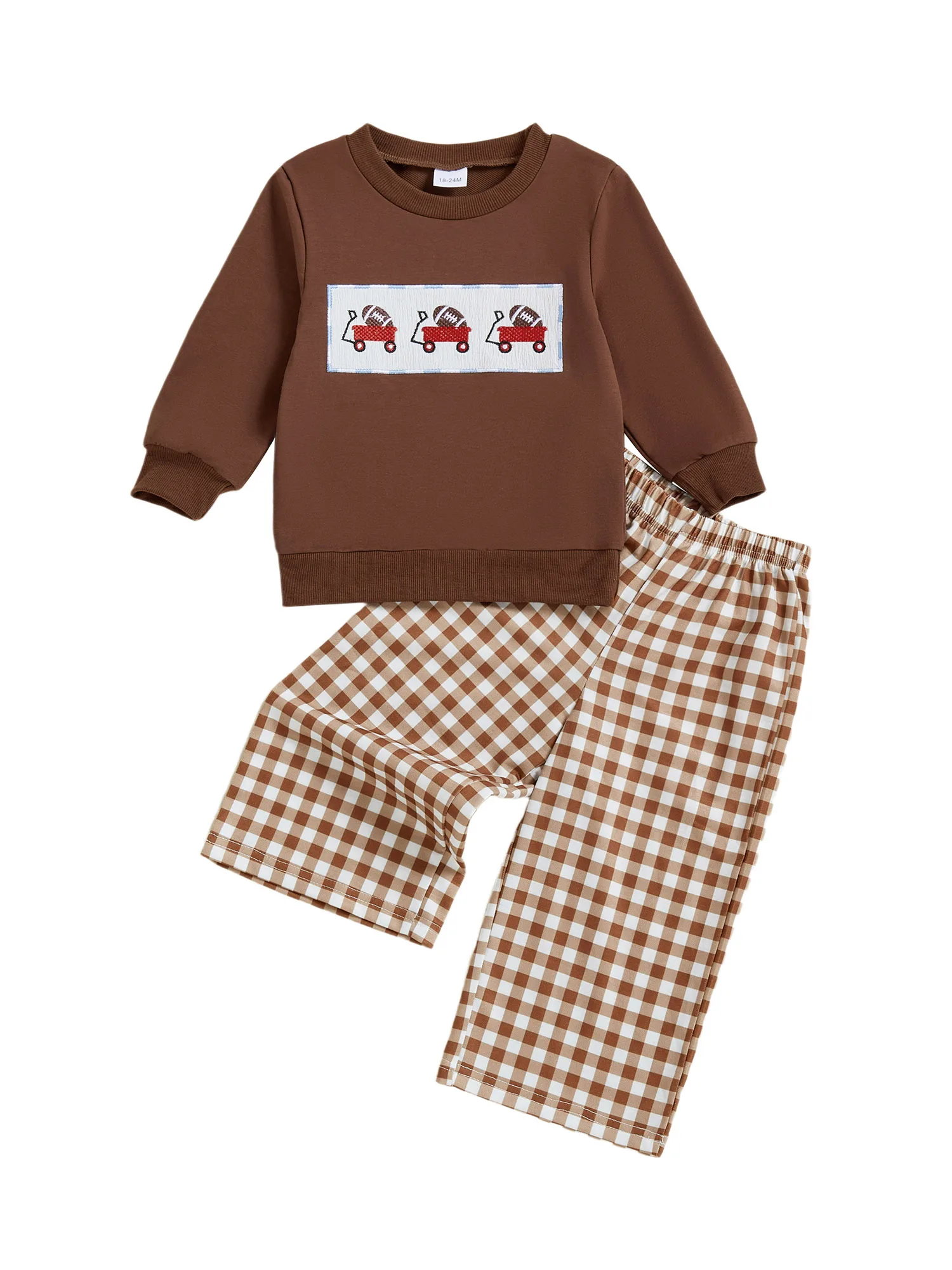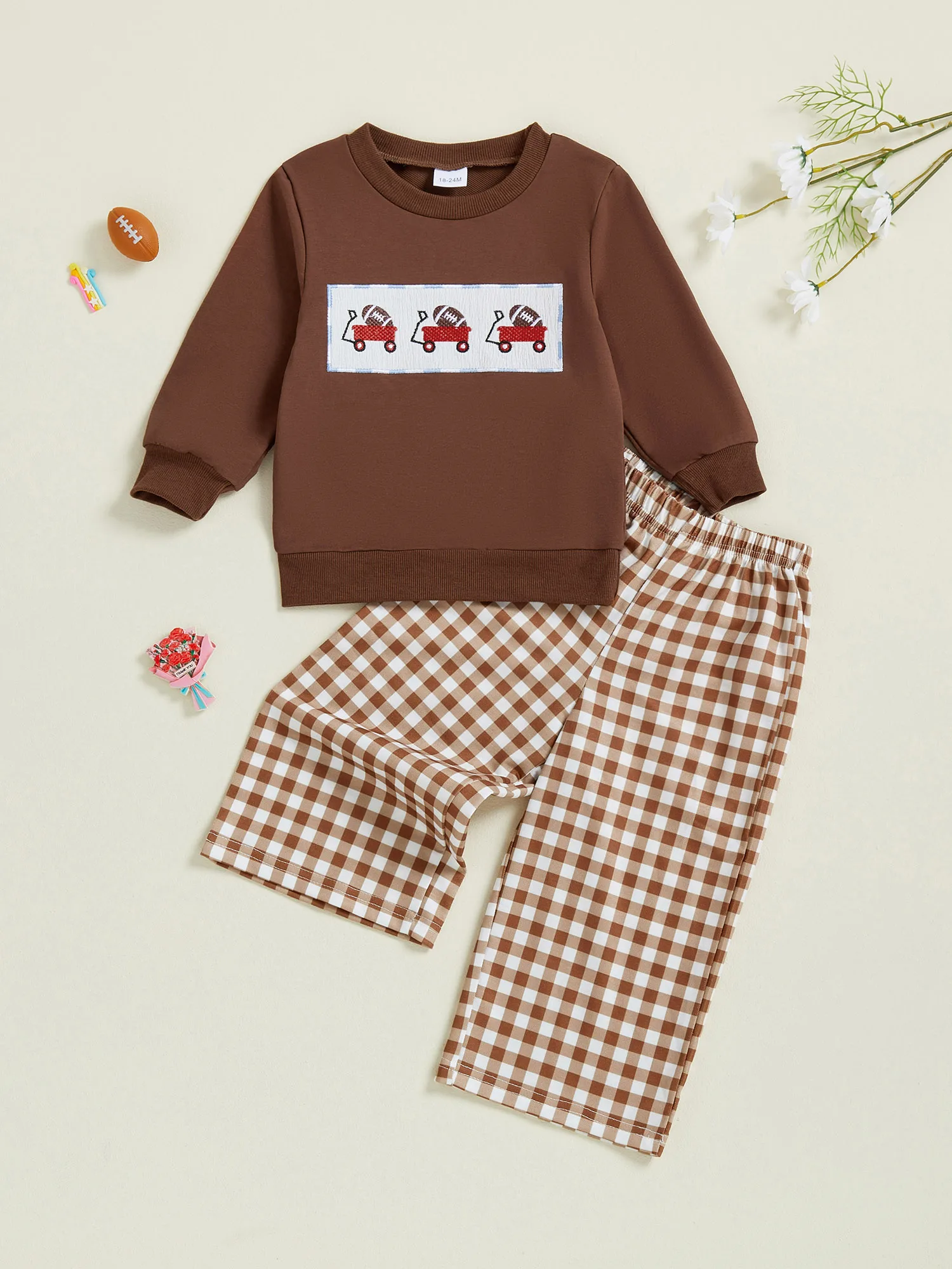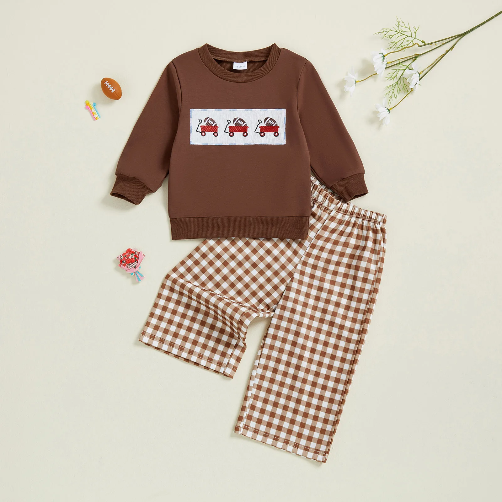 Baby boy fall outfit is warm and cozy; Boys sweatshirt with rugby embroidery, crew neck, long sleeve design; Baby boy pants with plaid print and elastic waist design ensures a comfortable fit, perfect for daily wear
