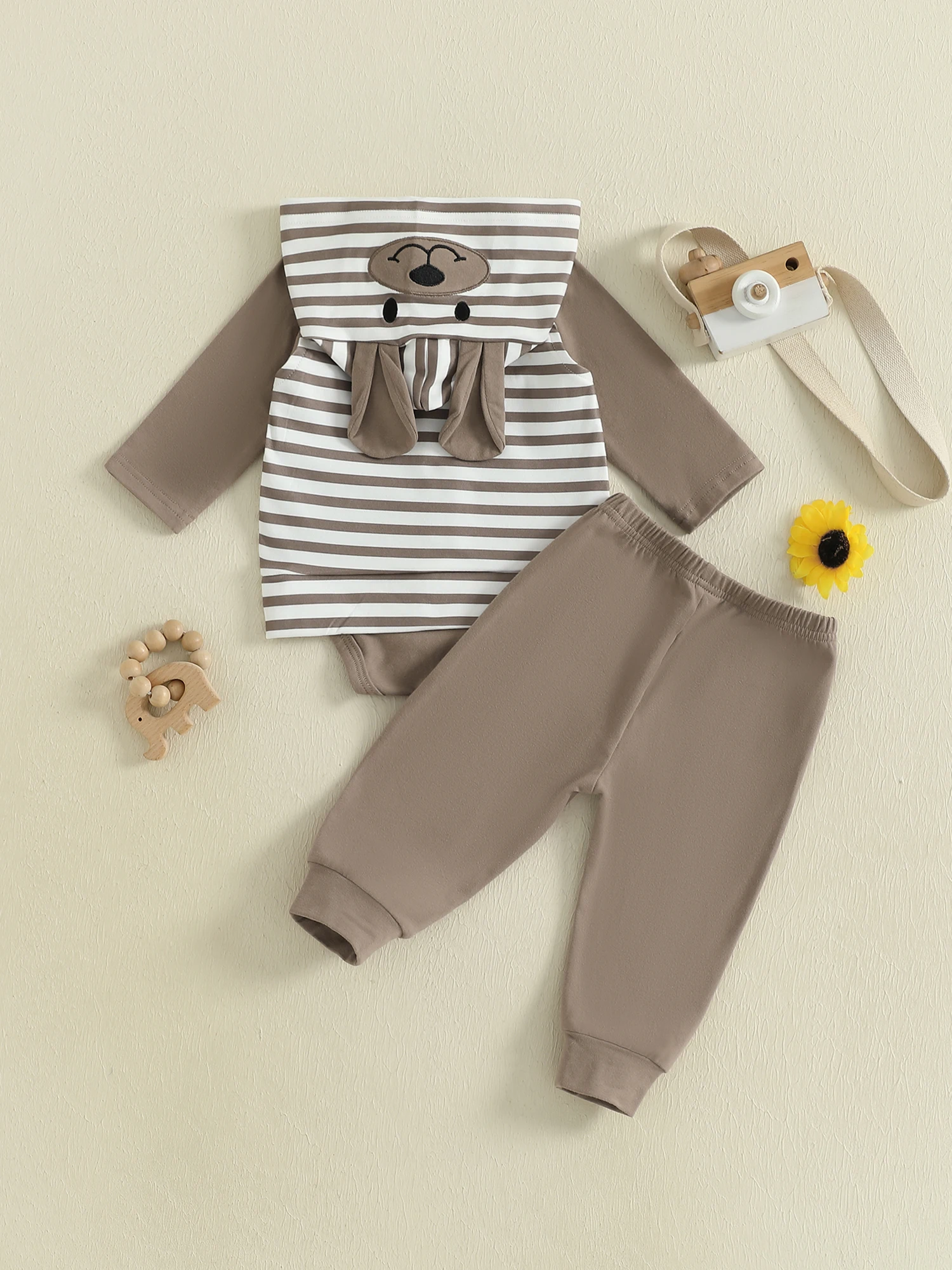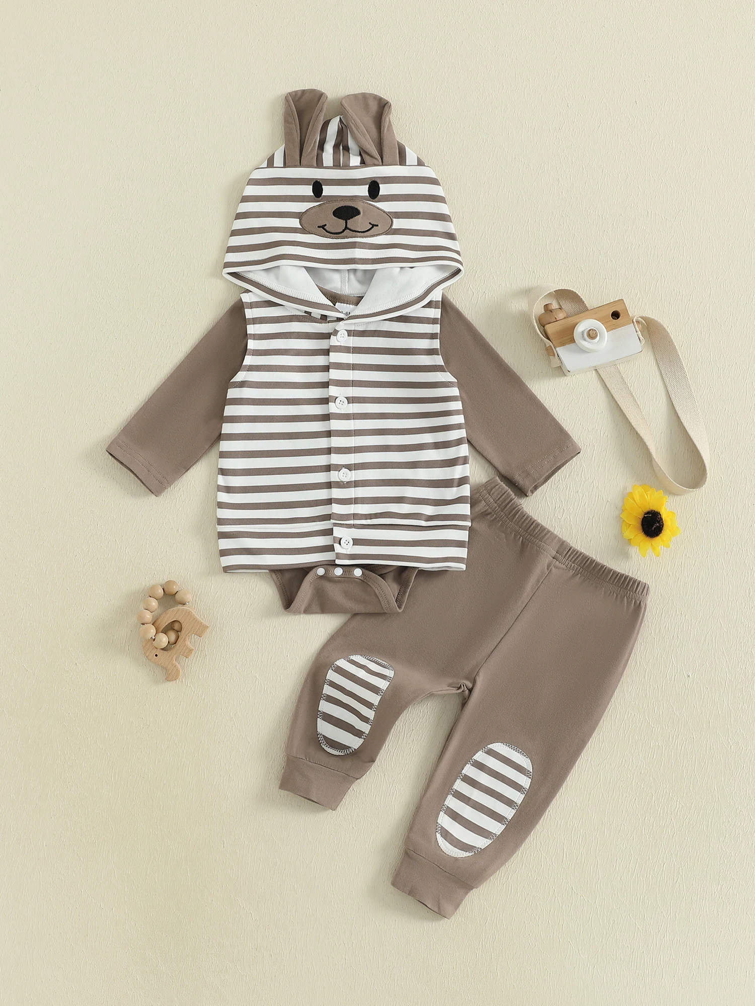 Baby Boys Pants Set, Long Sleeve Romper with Sweatpants and Striped Hooded Vest Fall OutfitThe baby boys pants set is a must-have outfit for baby boys in autumn, he will love it! Easy outfit!