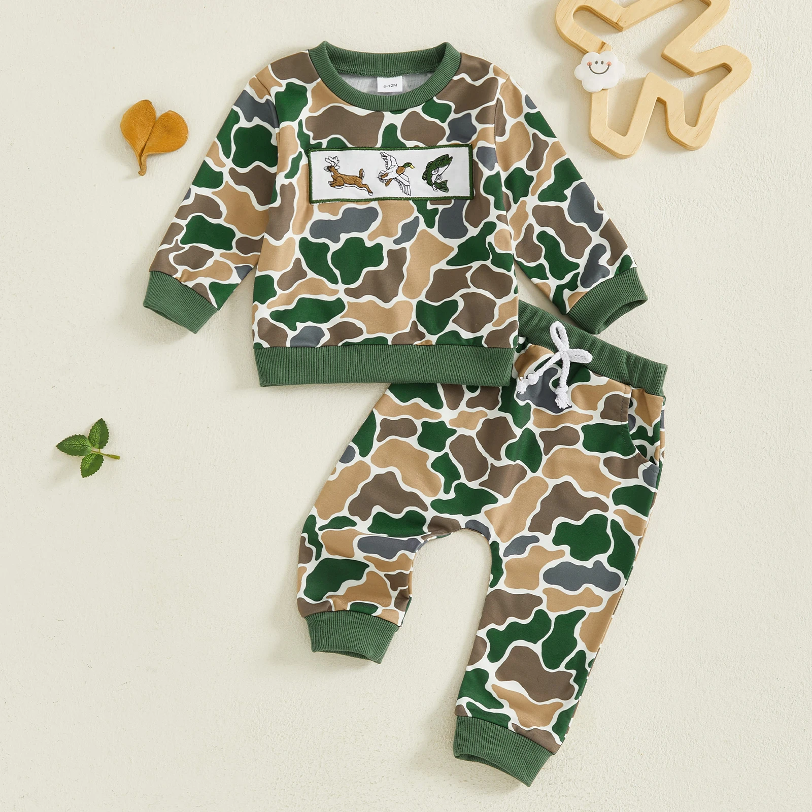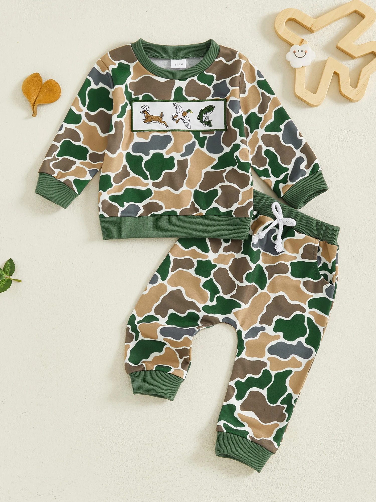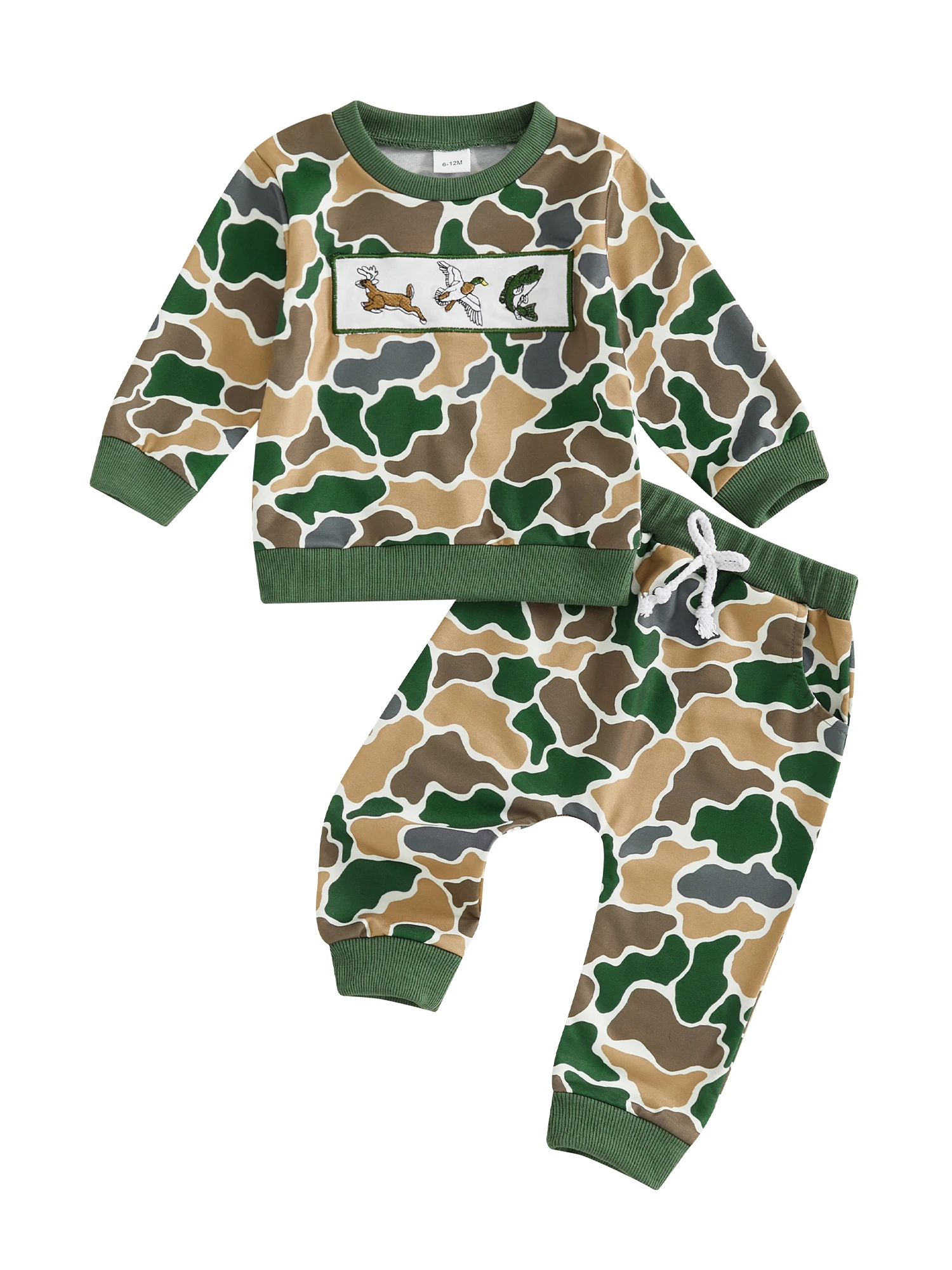 Baby Boys Pants Set, Long Sleeve Crew Neck Embroidery Animal Sweatshirt with Camouflage Sweatpants Infant ClothesThe baby boys pants set is a must-have outfit for baby boys in autumn, he will love it! Easy outfit!