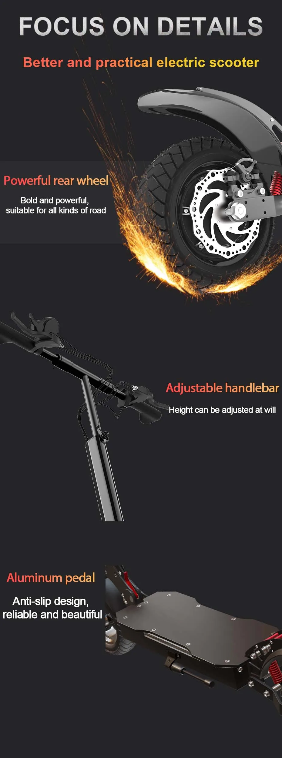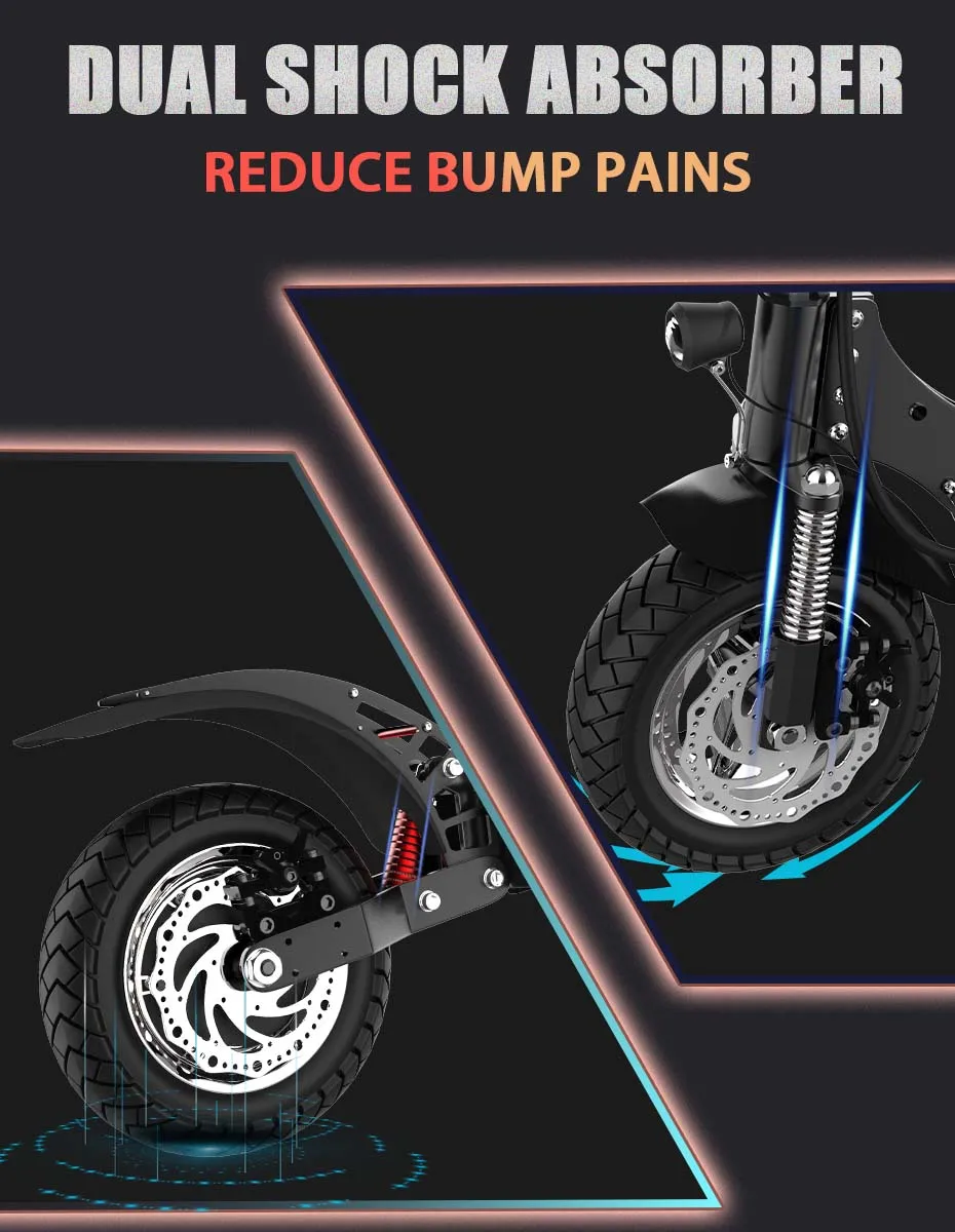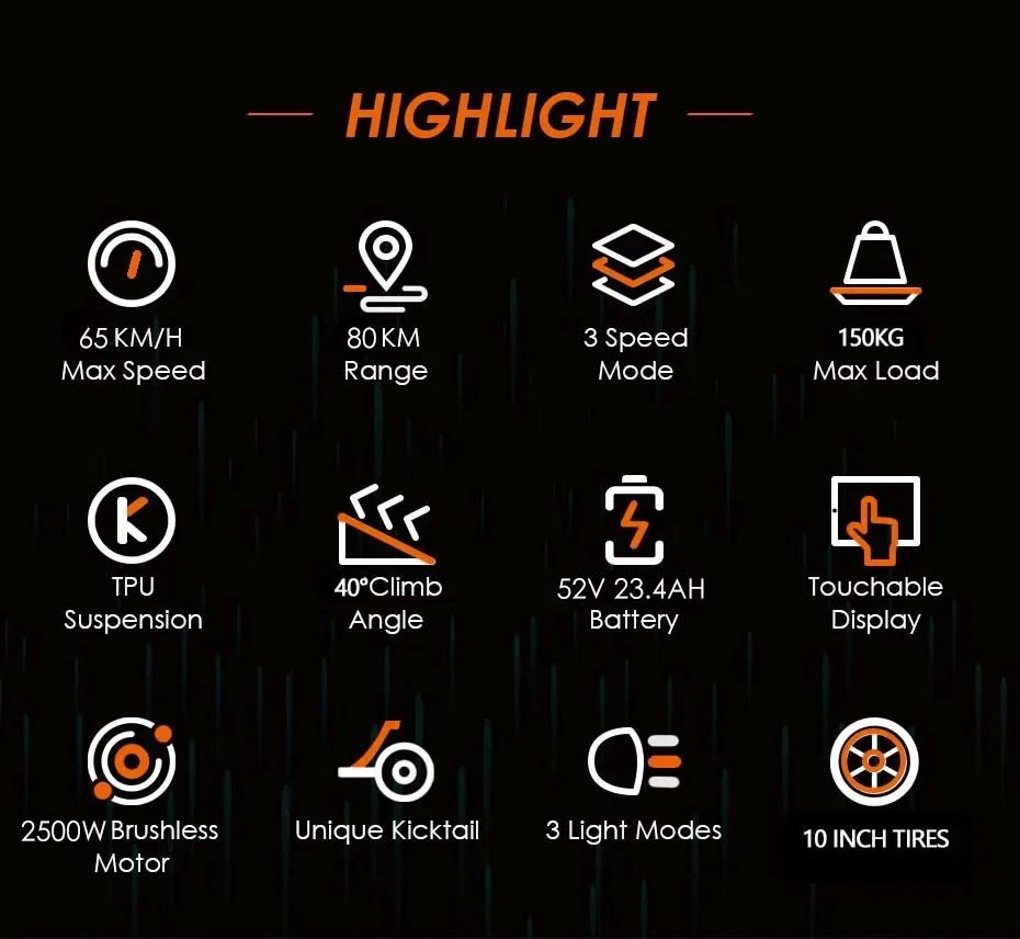 X750 Motorized Scooter – your ideal urban ride. Built strong yet light with reinforced aluminum alloy. Smooth 10-inch street vacuum tires. Zoom at 37.5MPH with the 52V 2500W motor, 35-40 miles per charge. Reliable double disc brakes, plus EBAS electronic brake. Glide comfortably with dual spring shock absorbers. Stay secure with electronic anti-theft. Bright full headlights, turn signals, and brake lights. Easy fold design, quick 3-6 hour charge with 58.8V 3A charger. Perfect for 59-78 inch riders. Elevate your commute with style, speed, and dependability – the X750.