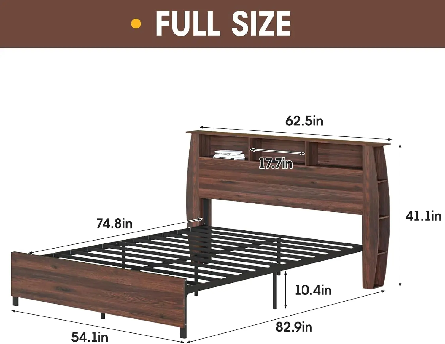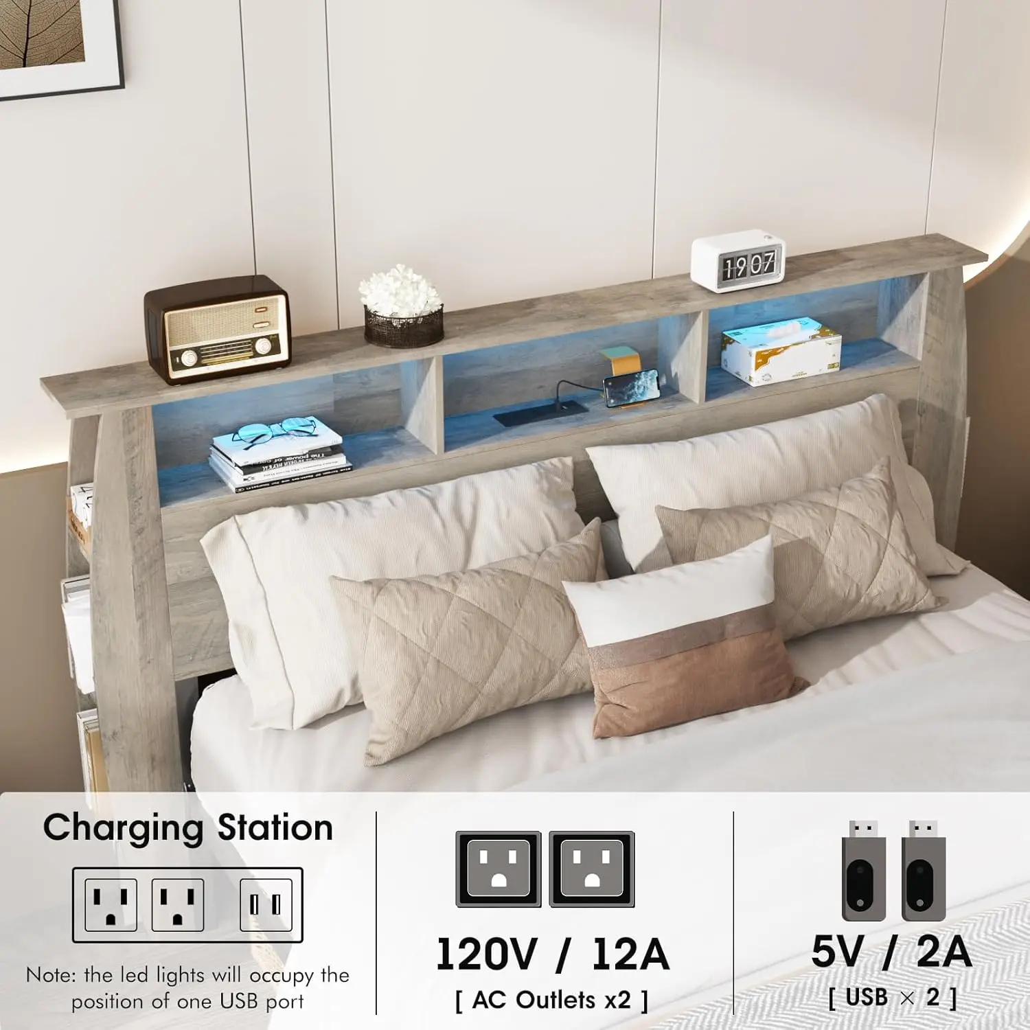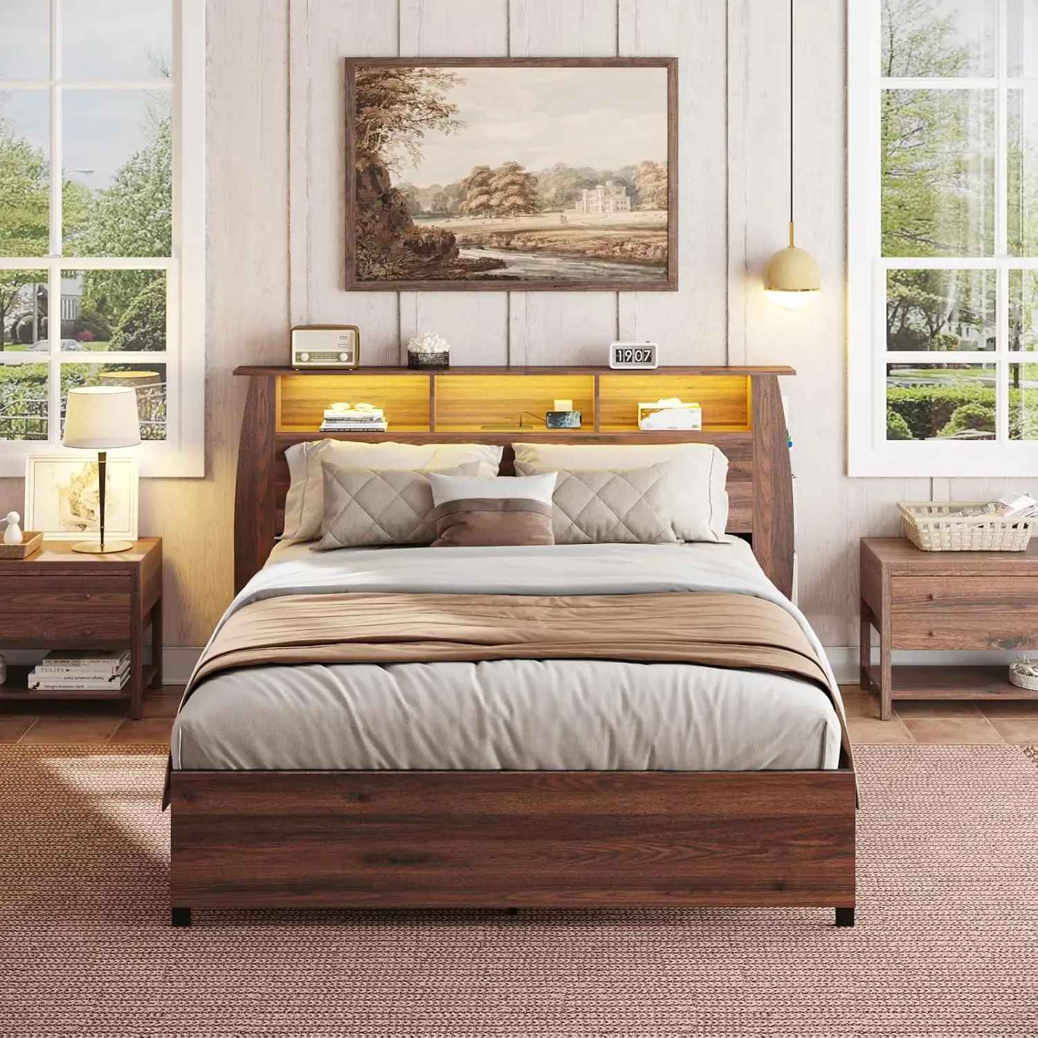 Vabches Bed Frame Full Size with 2-Tier Storage Headboard Wooden Platform Bed Frame with Charging Station&LED Light Noise-Free