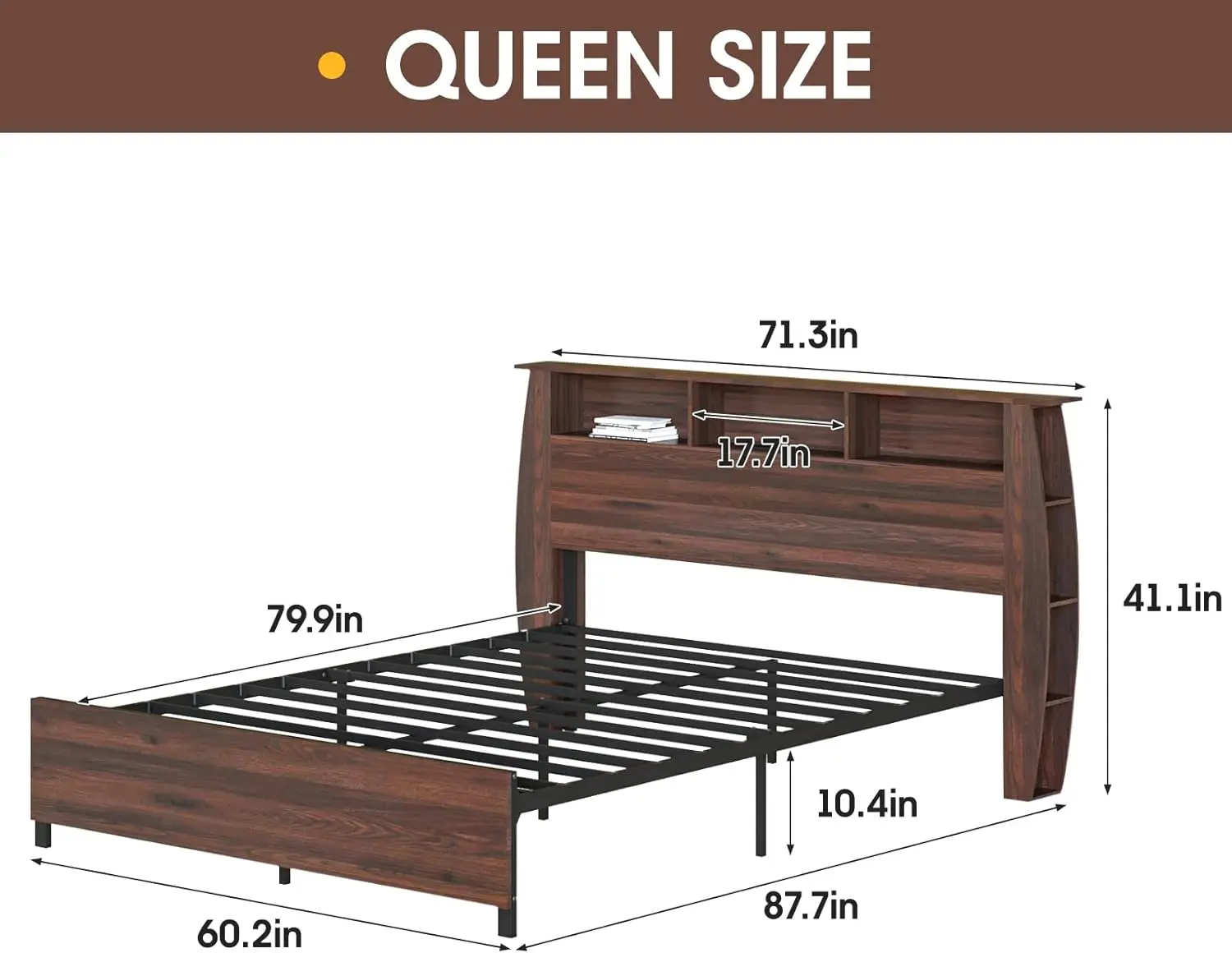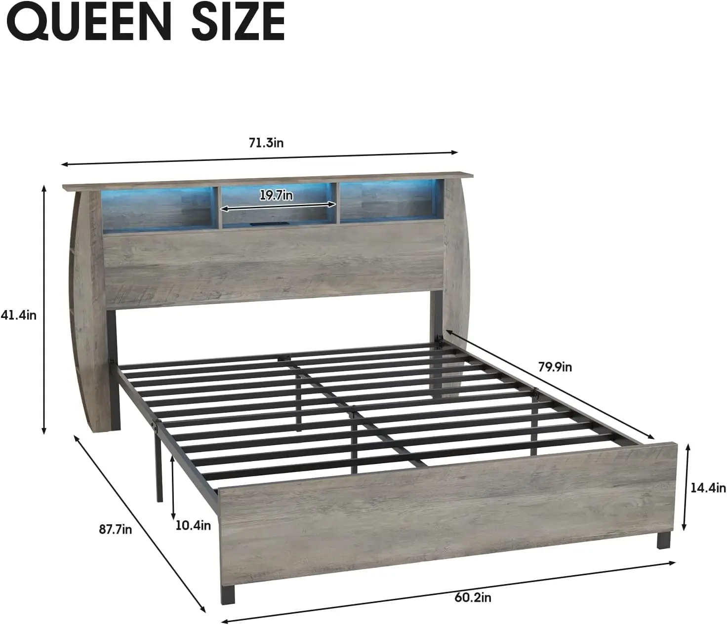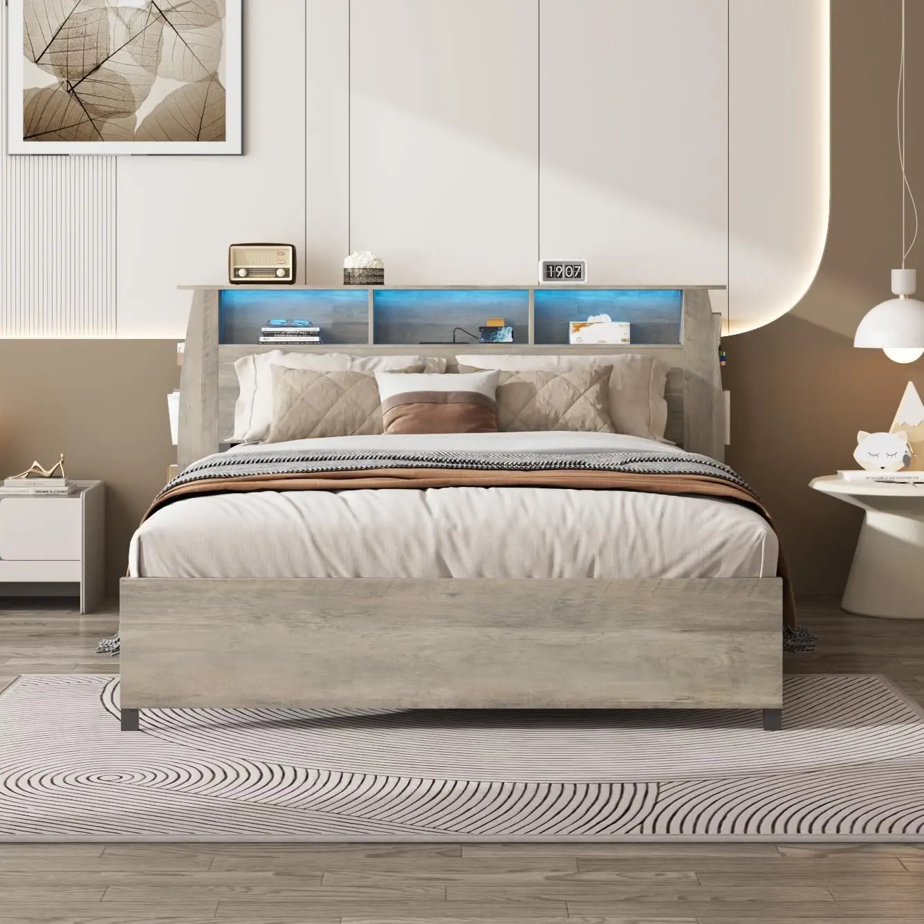 Vabches Bed Frame Full Size with 2-Tier Storage Headboard Wooden Platform Bed Frame with Charging Station&LED Light Noise-Free