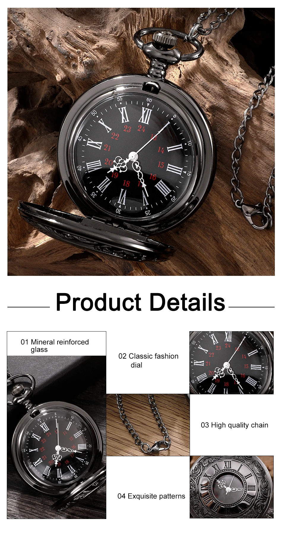 • Stainless Steel Bezel and Dial Material :The stainless steel bezel and dial material give the pocket watch a durable and long-lasting quality.