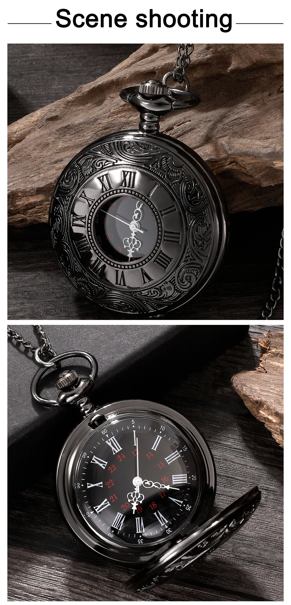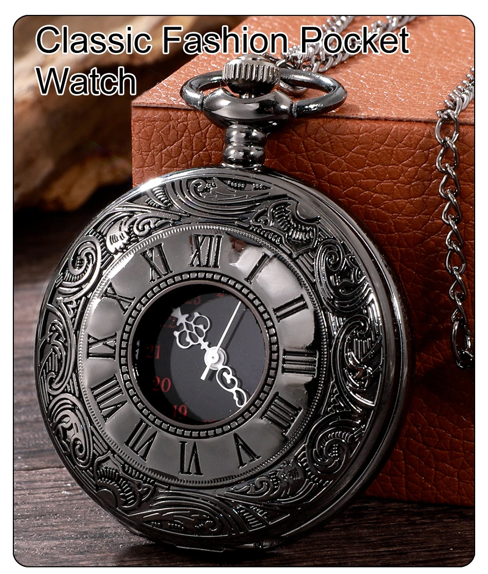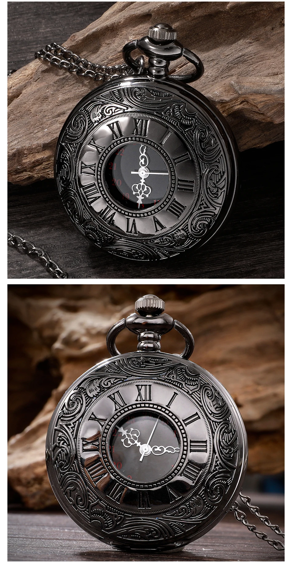 Vintage Charm Black Unisex Fashion Roman Number Quartz Steampunk Pocket Watch Women Man Necklace Pendant with Chain Gift