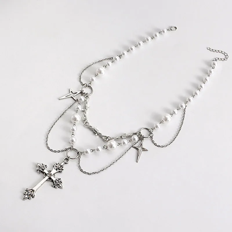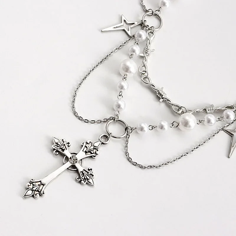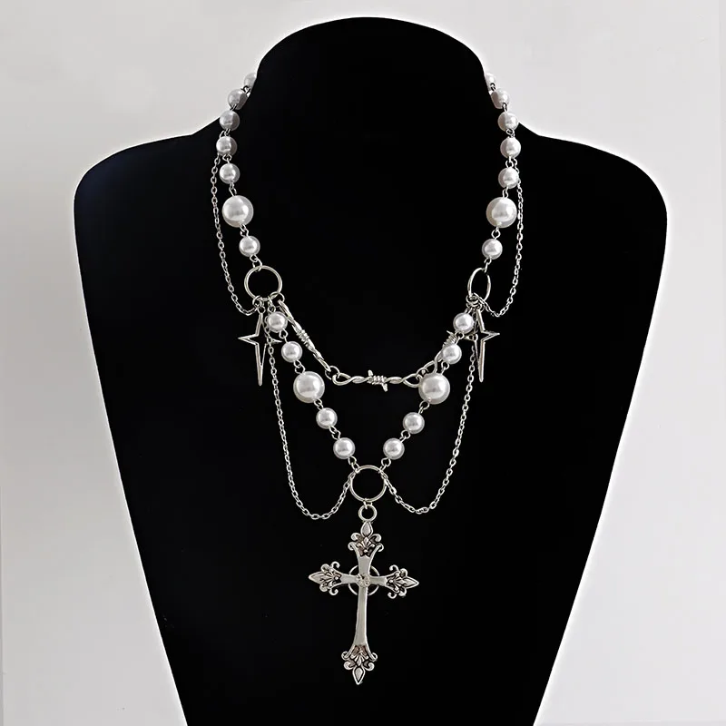 Vintage Gothic Cross Rosary Necklaces Women Punk Layered Chain Charm Handmade Sacred Pearl Beaded Choker Necklace Girl Gifts